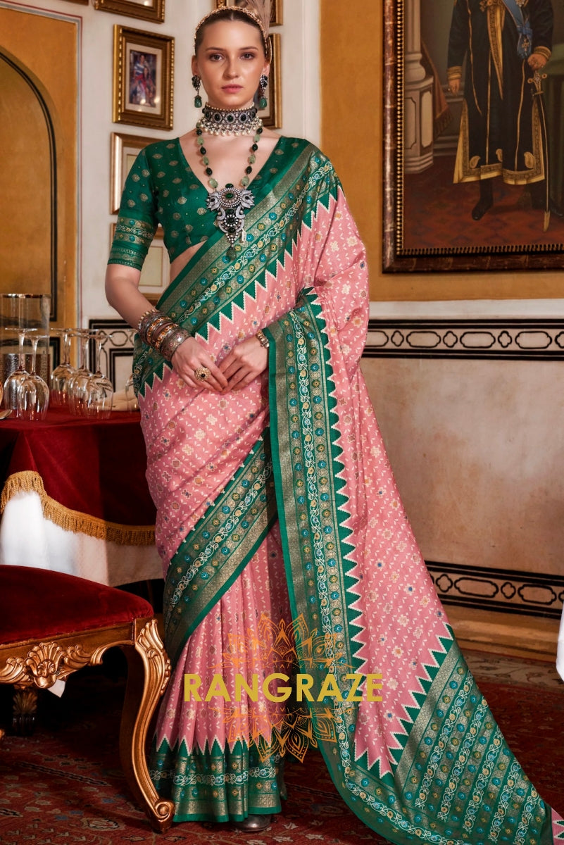 Blush Rose Patola Silk Saree with Emerald Weaving Border