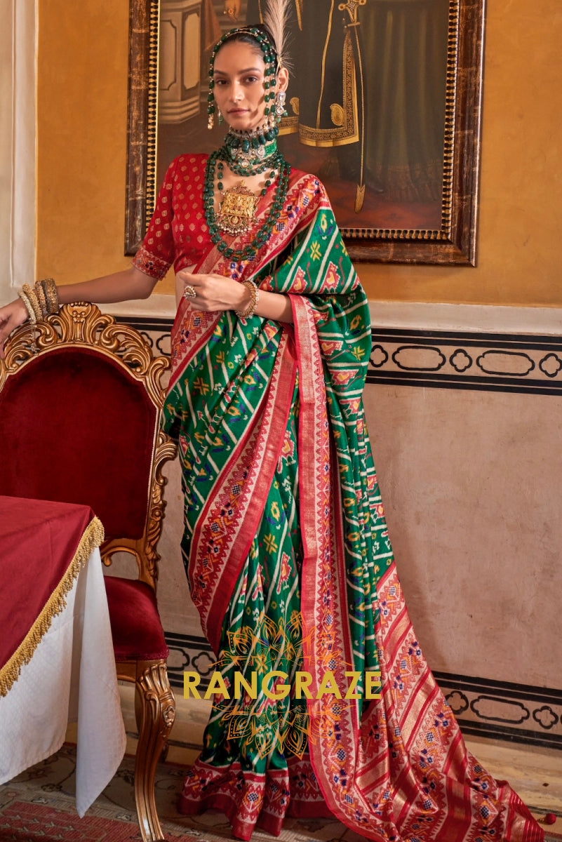 Majestic Emerald and Red Patola Silk Saree with Ornate Border