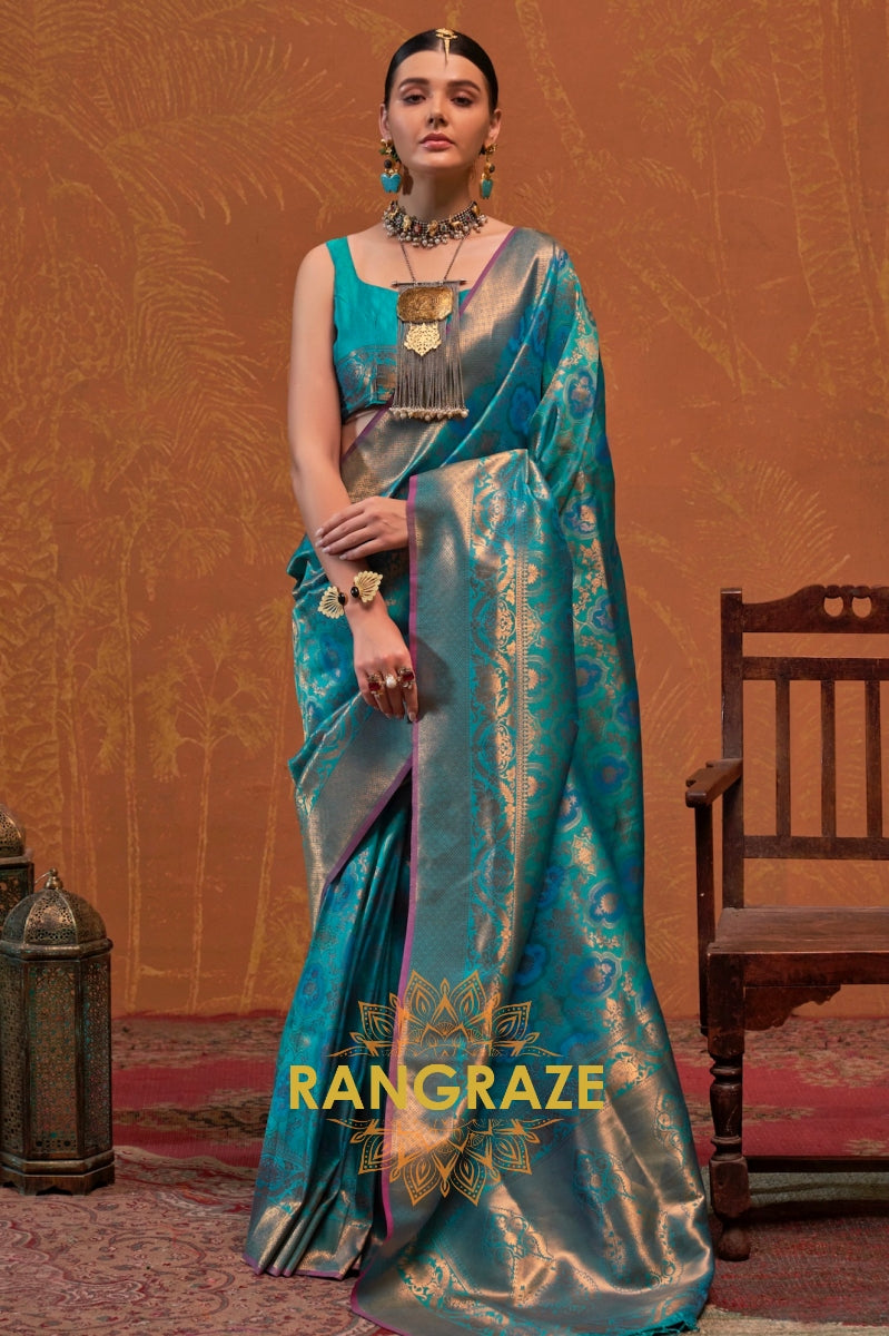 Aquamarine Banarasi Silk Saree with Peacock Blue Blouse – A Celebration of Timeless Elegance