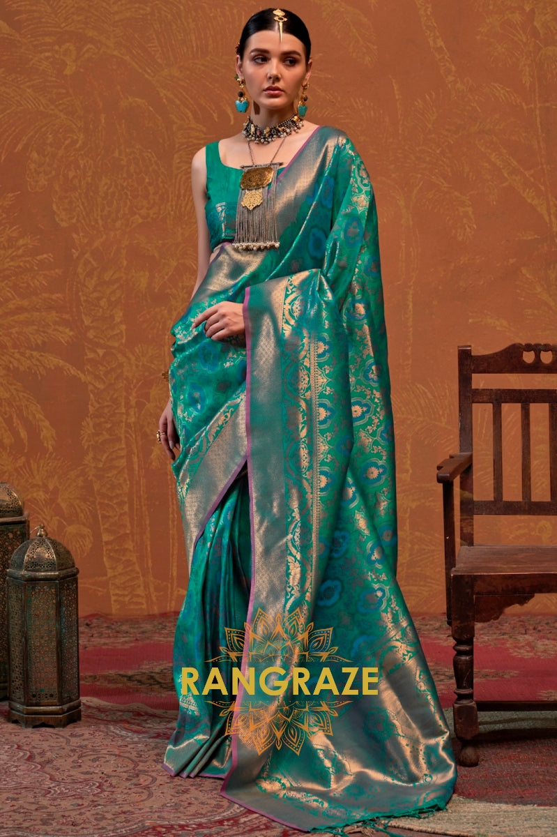 Ice Blue and Emerald Green Banarasi Silk Saree – A Symphony of Grace and Royalty