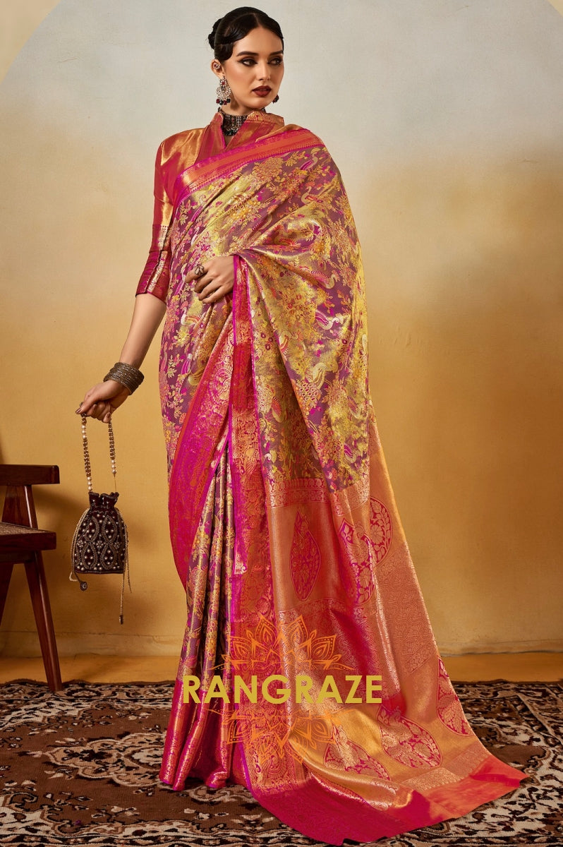 Orange Pink Woven Banarasi Soft Silk Saree