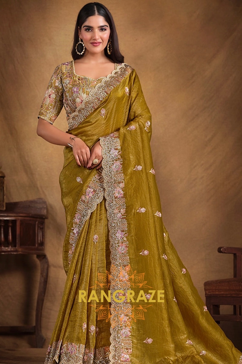 Mustard Radiance Designer Hand Embroidered Paper Silk Saree