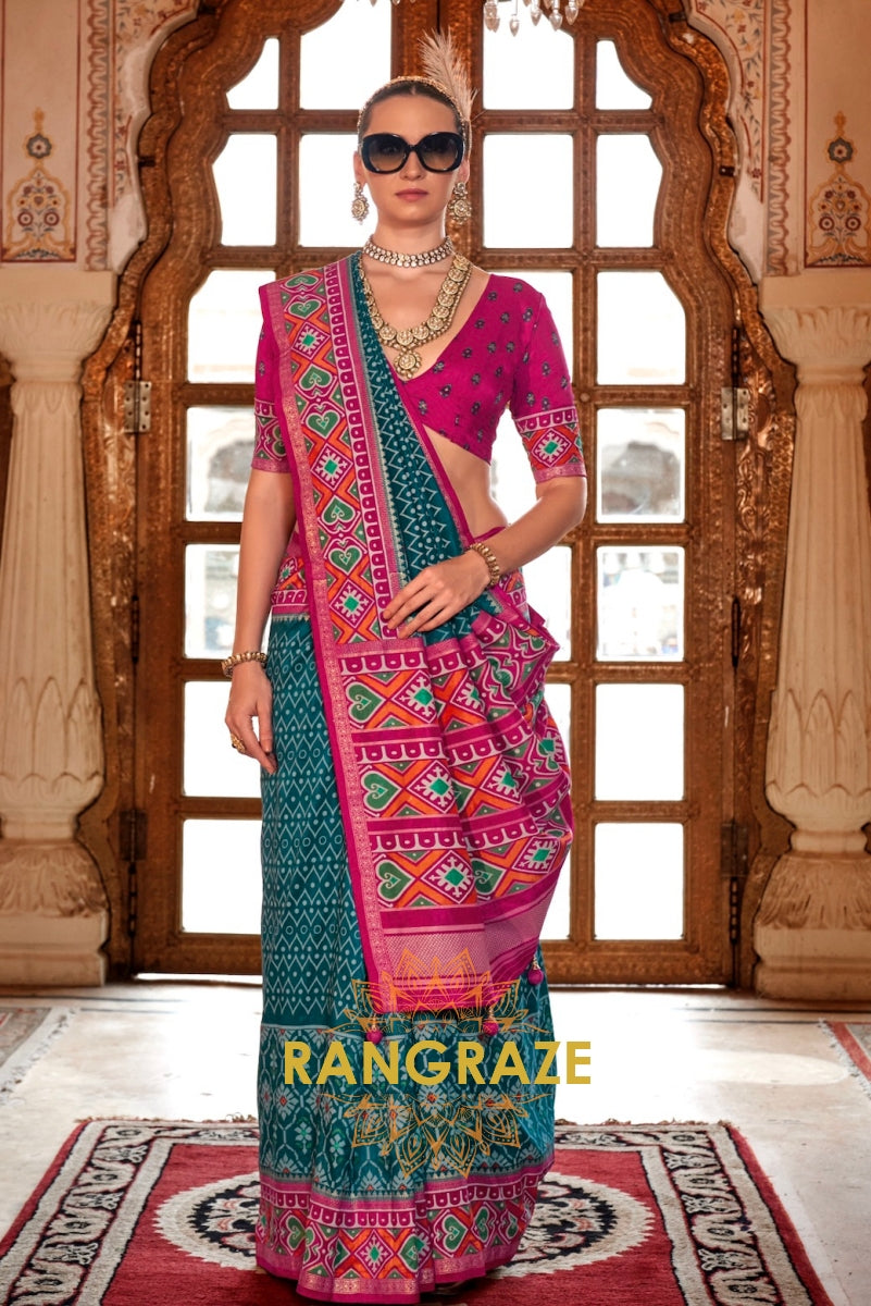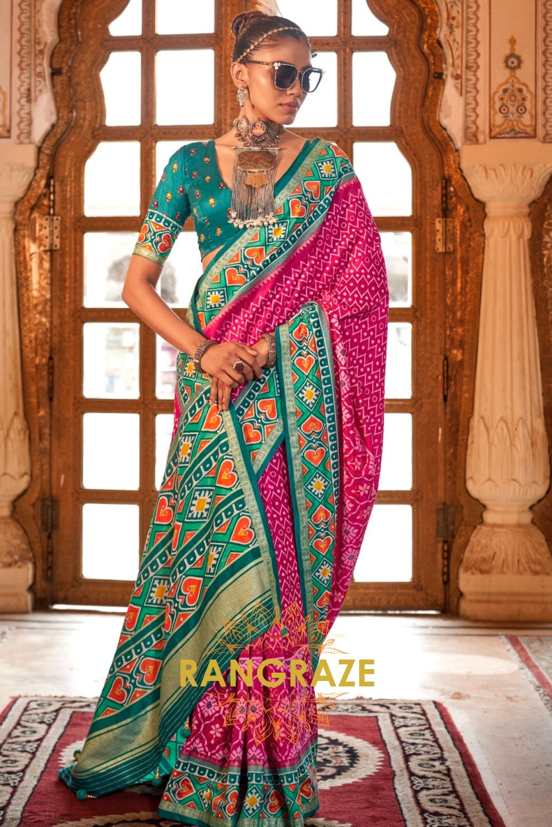 Vibrant Fuchsia and Teal Green Patola Silk Saree with Contrasting Border