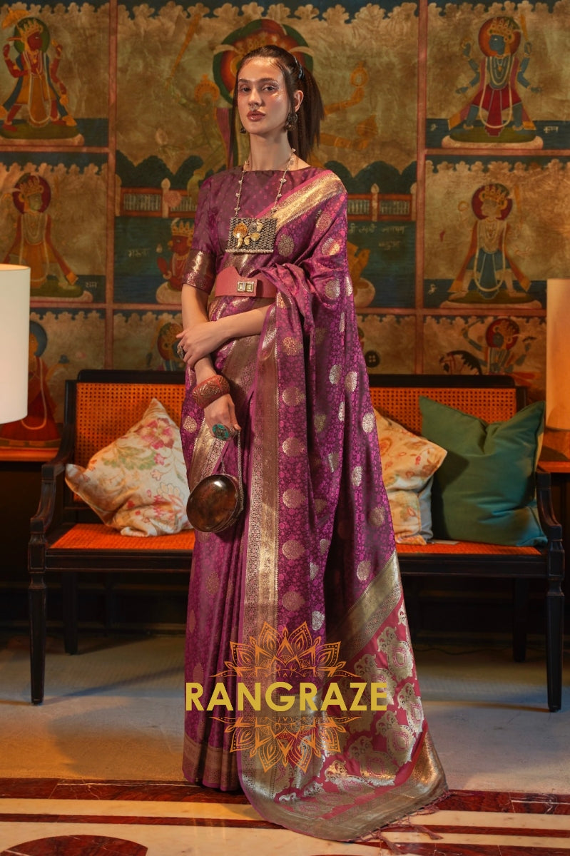 Mulbery Purple Banarasi Satin Silk Saree with Contrast Blouse
