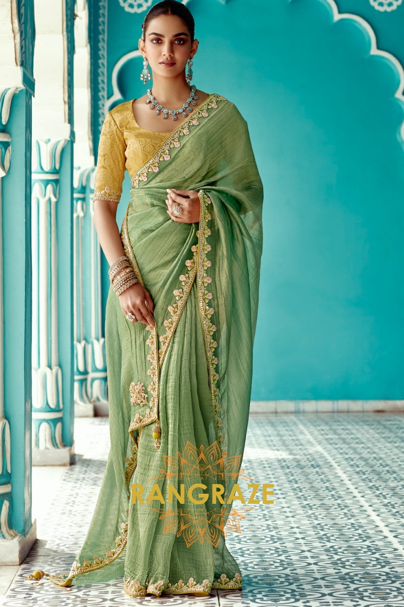 Pastel Green Charm: Designer Embroidered Crush Organza Saree