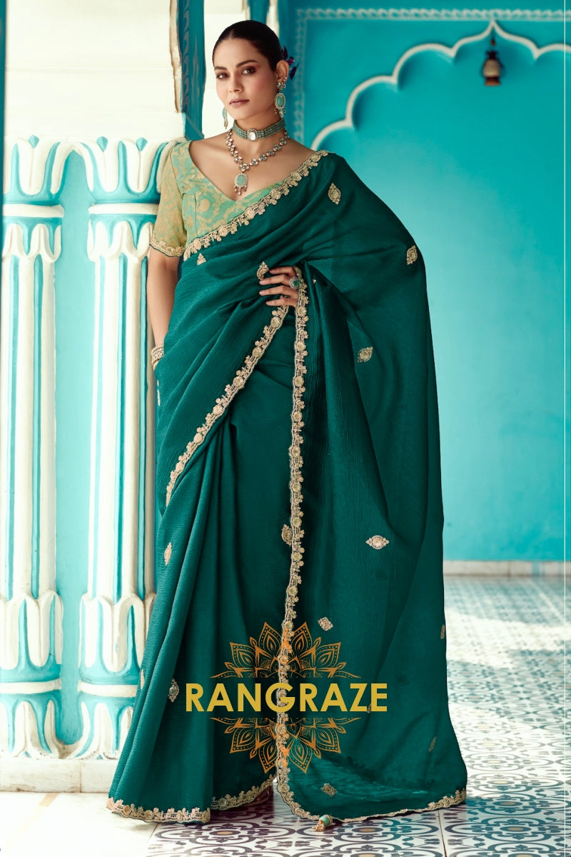 Emerald Grace: Embroidered Crush Organza Saree
