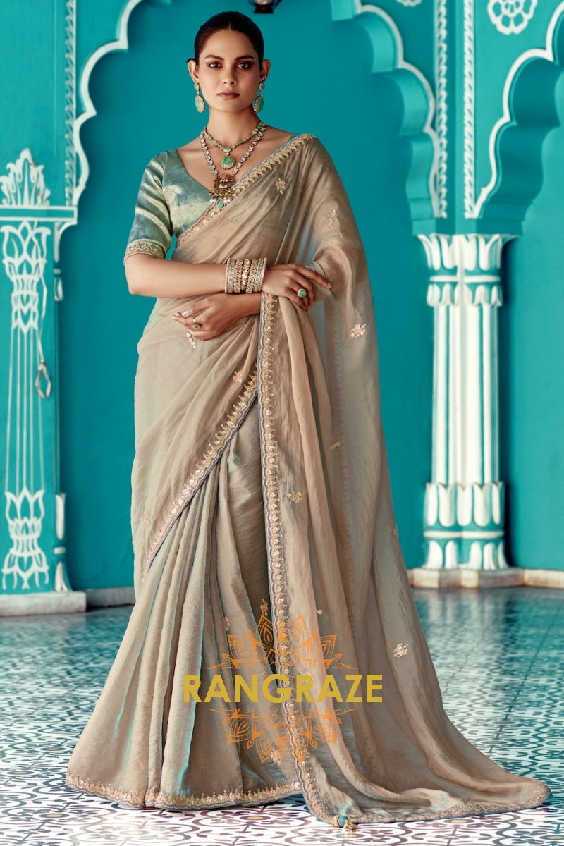 Moonlit Taupe: Embroidered Organza Elegance Saree