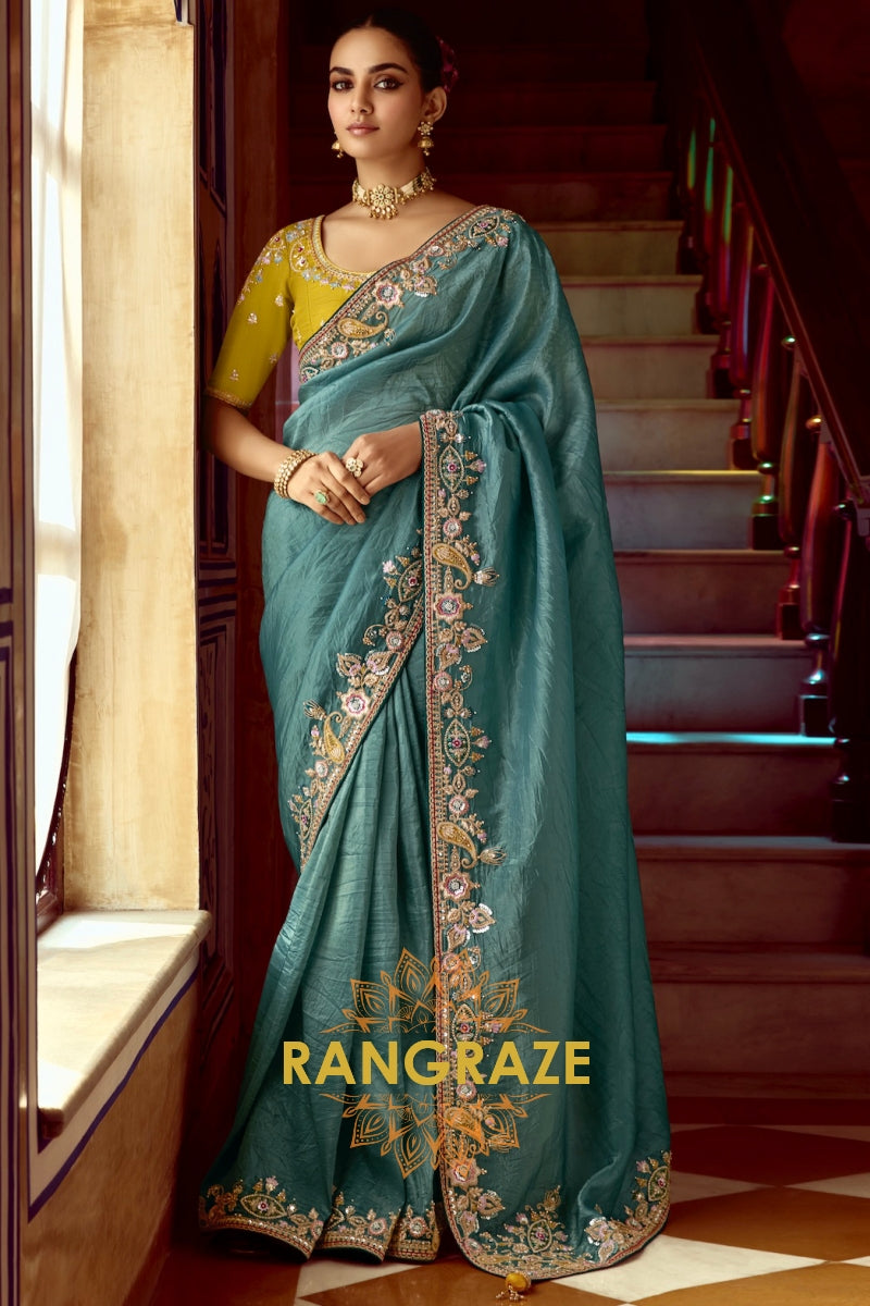 Aqua Green Organza Tissue Silk Saree