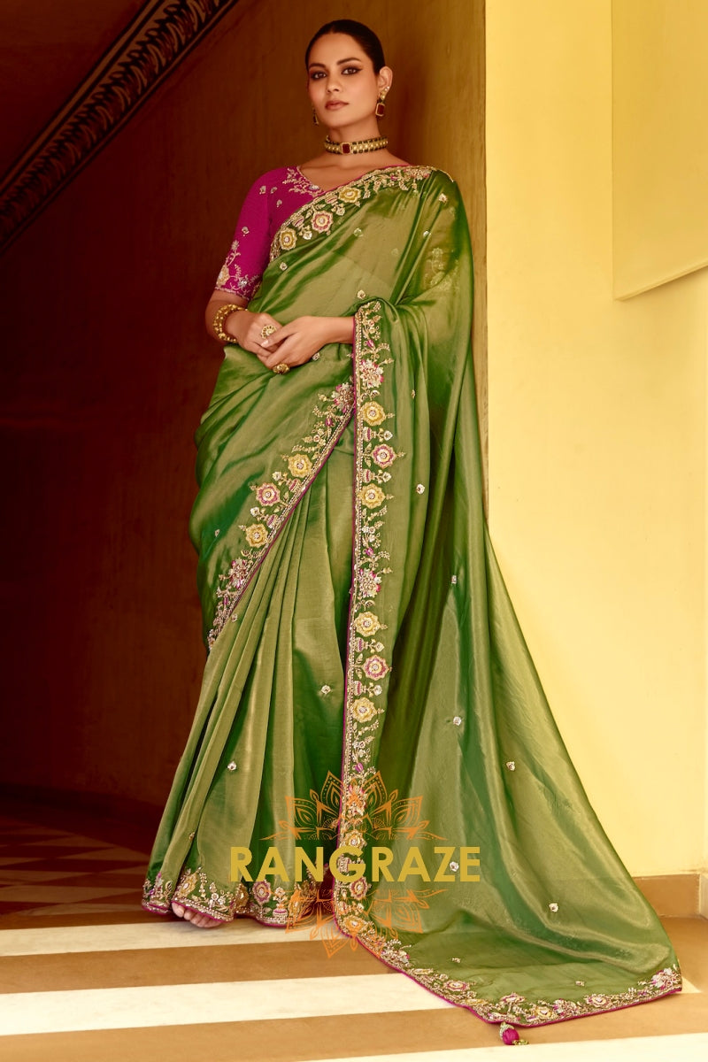 Olive Opulence Organza Saree with Rani Pink Embroidered Blouse