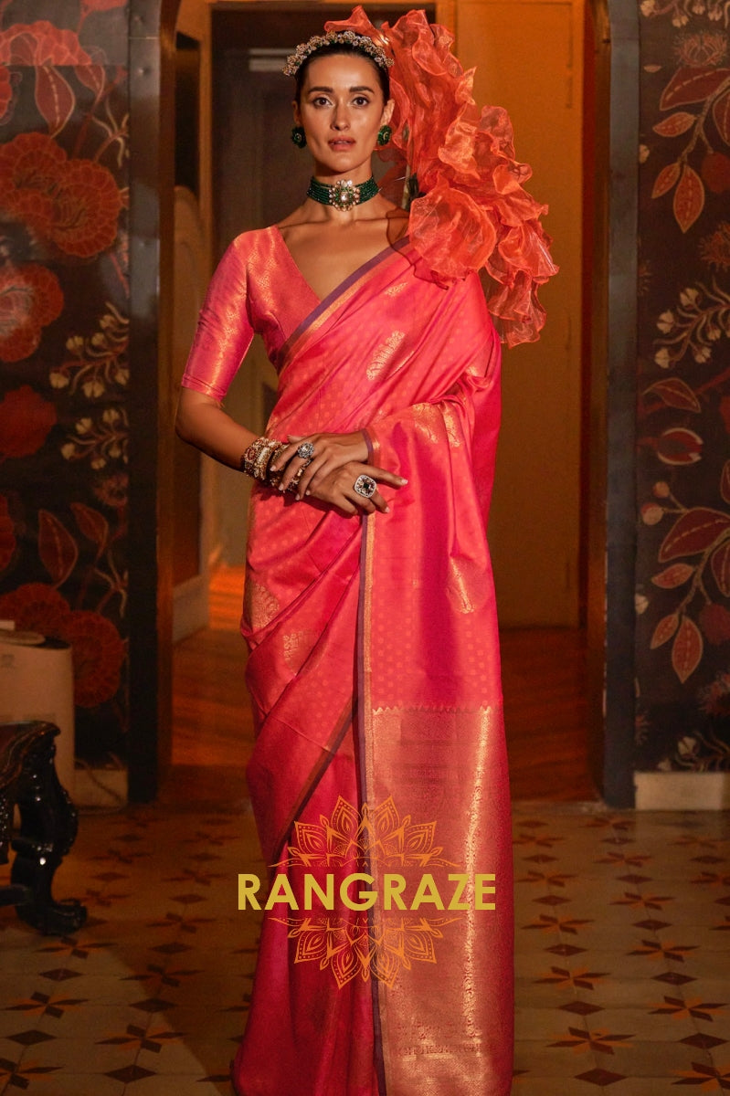 Blush Pink and Coral Woven Kanjivaram Silk Saree