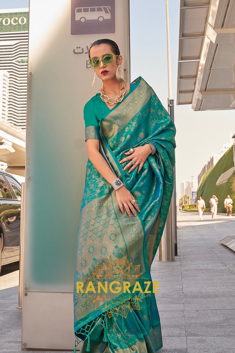 Turquoise Blue And Golden Woven Banarasi Organza Silk Saree