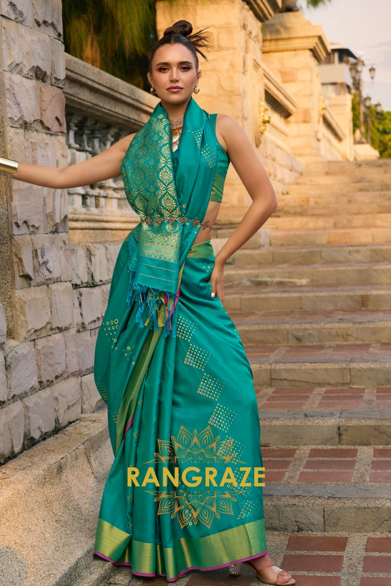 Teal Turquoise Rangkaat Woven Soft Silk Saree
