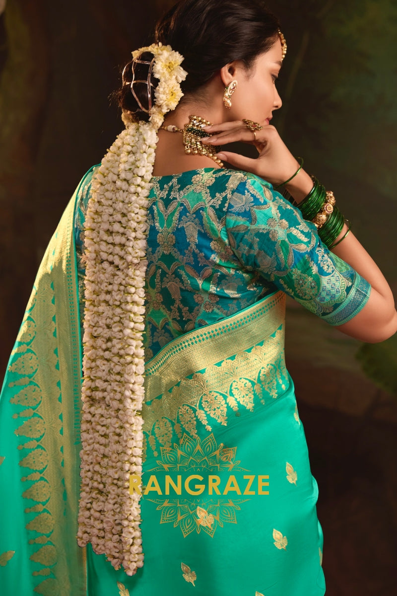 Turquoise Green Blossom Handloom Woven Banarasi Silk Saree
