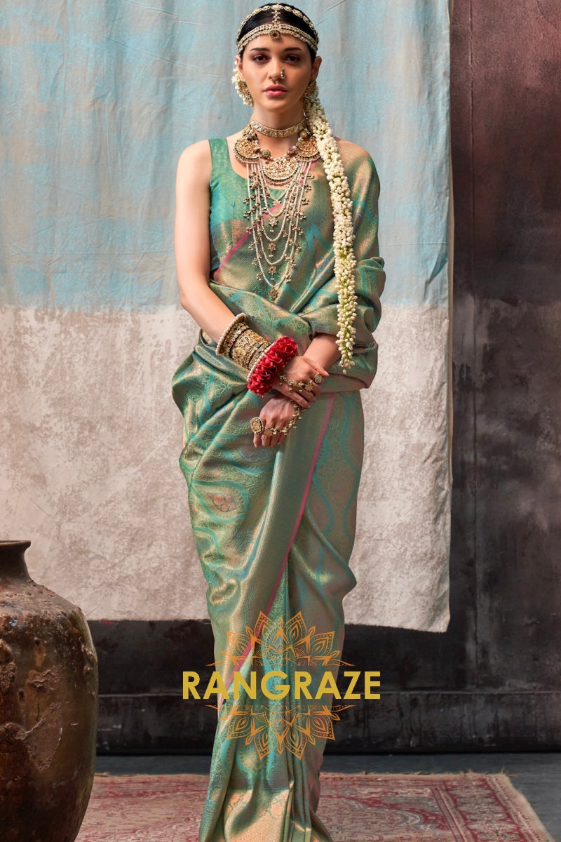 Sea Green Dual Tone Bronze Zari Woven Soft Silk Saree