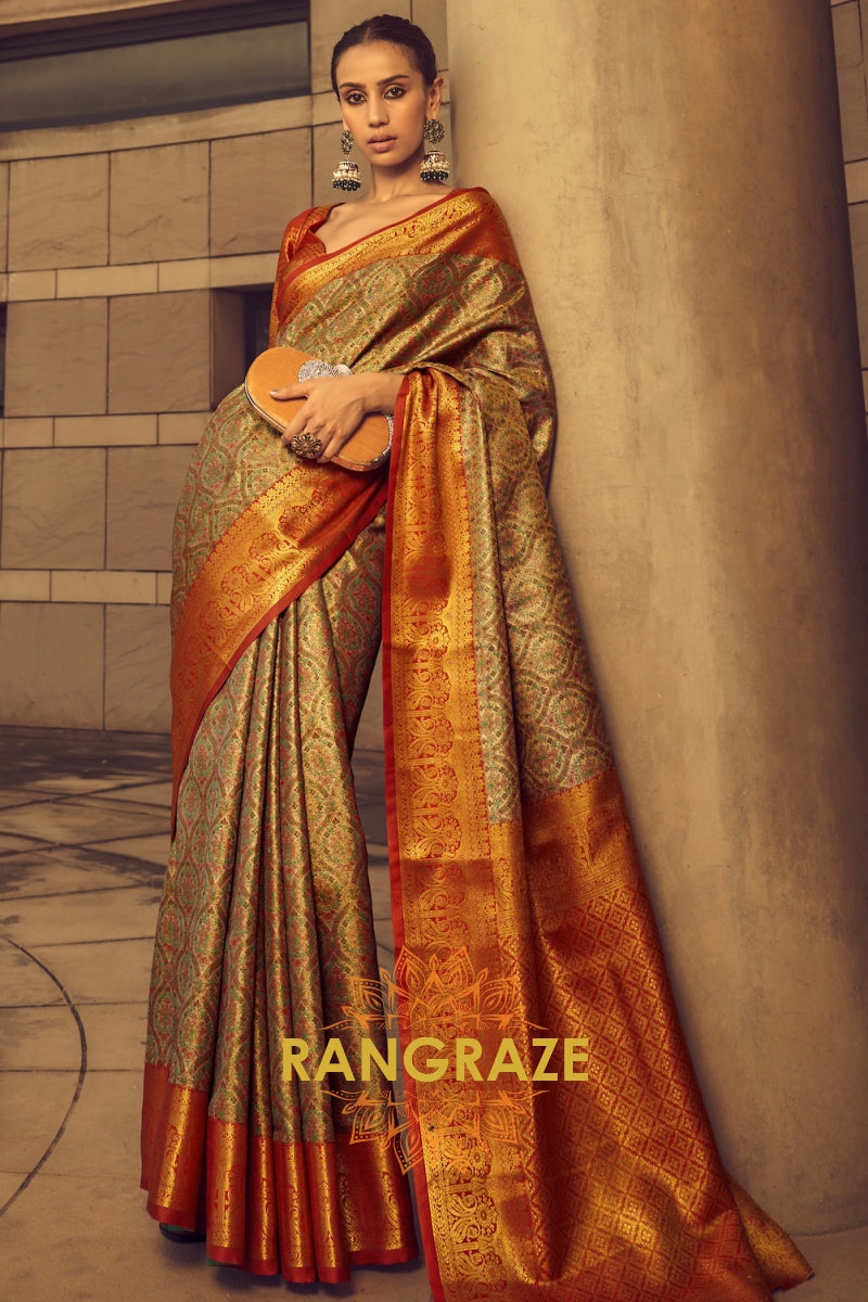 Grand Golden Grey Woven Banarasi Golden Zari Satin Silk Saree