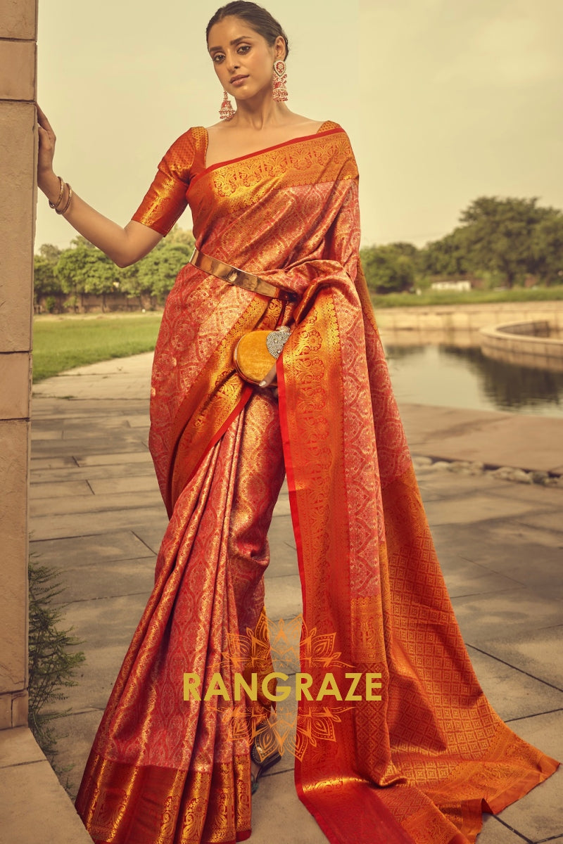 Bright Orange And Magenta Woven Banarasi Silk Saree