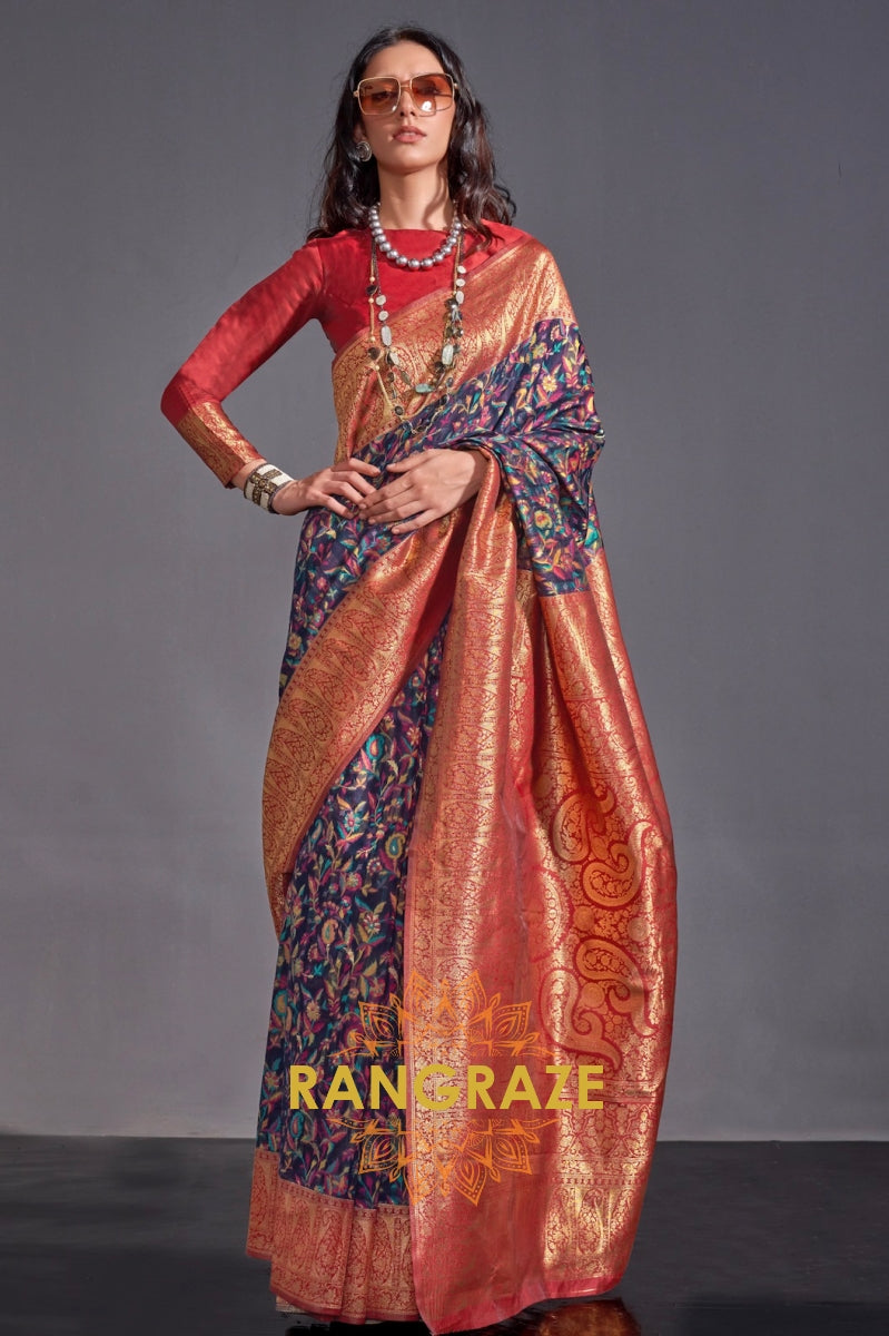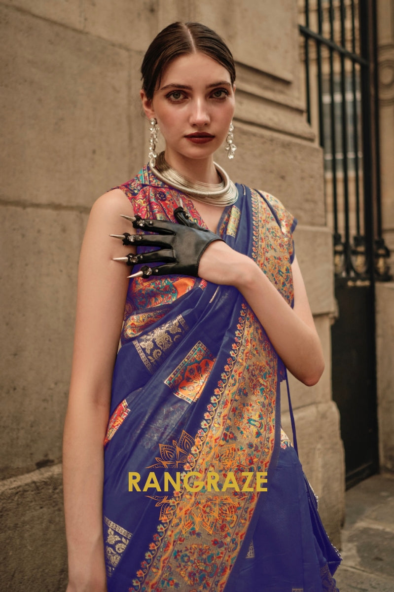 Luxe Navy Blue Woven Banarasi Kashmiri Silk Saree