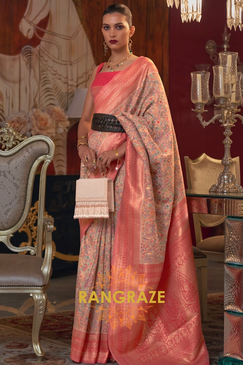 Magnetic Pinkish Orange Woven Banarasi Kashmiri Silk Saree
