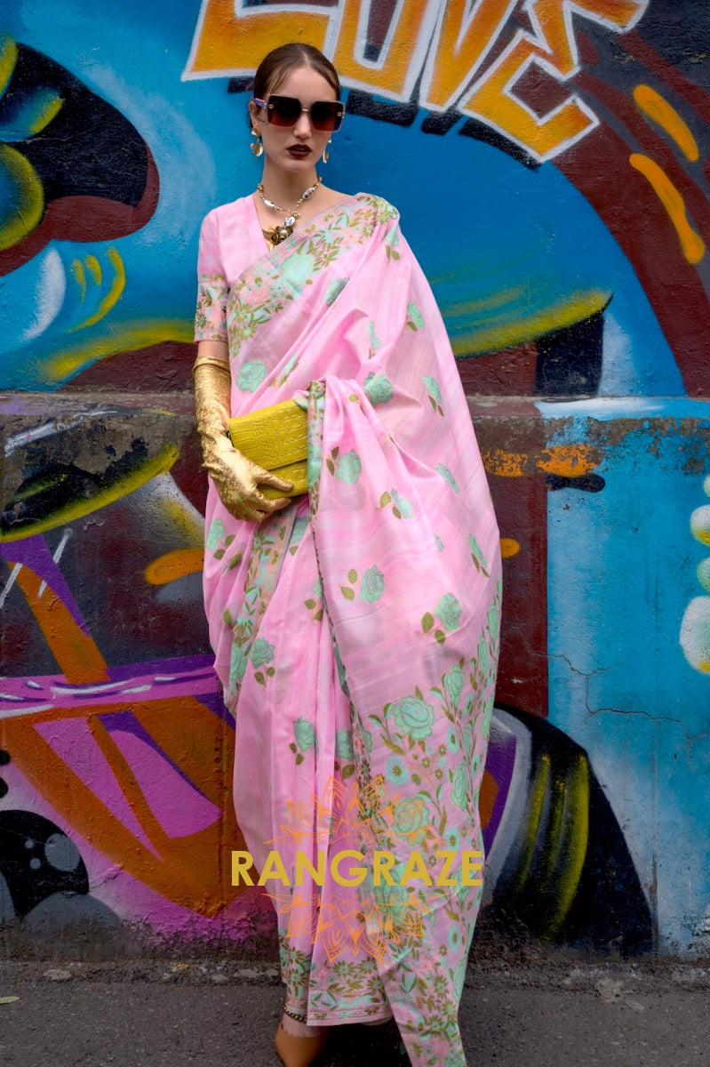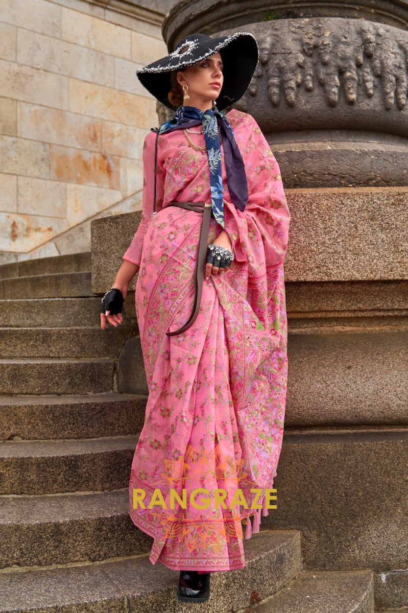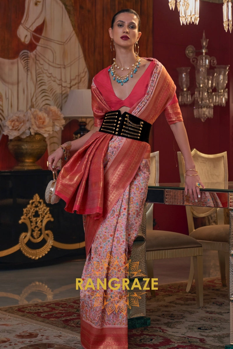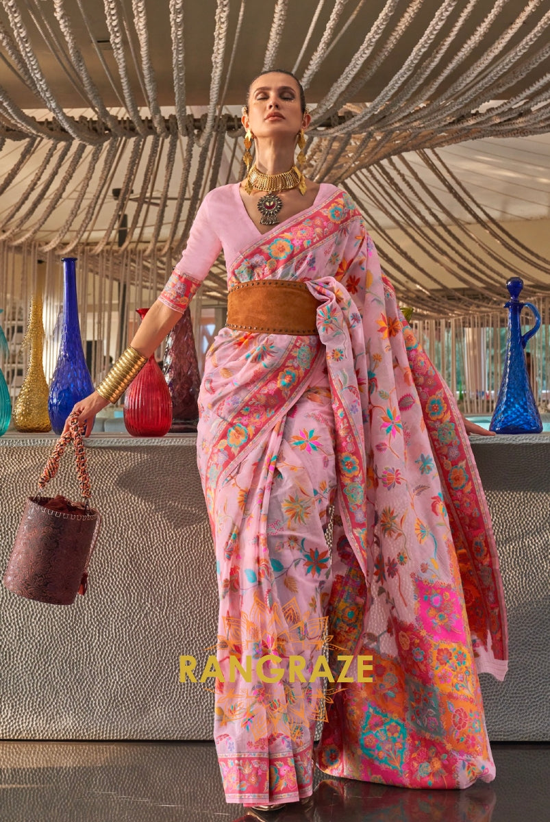 Magnetic Baby Pink Woven Banarasi Kashmiri Silk Saree