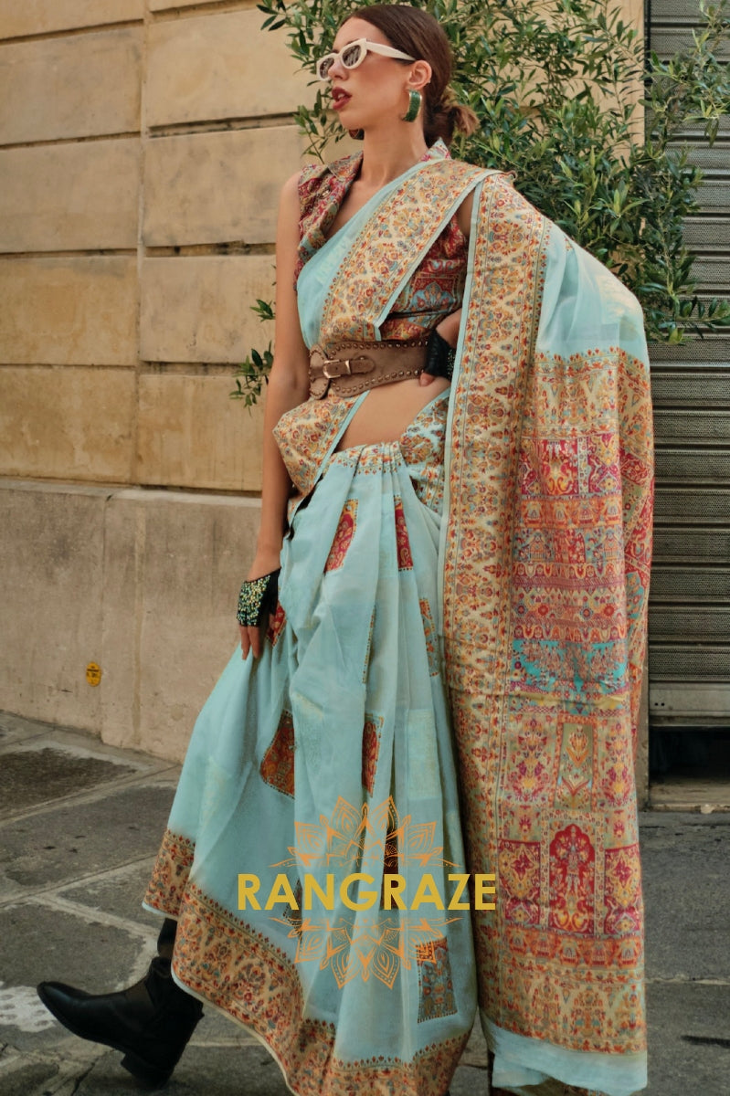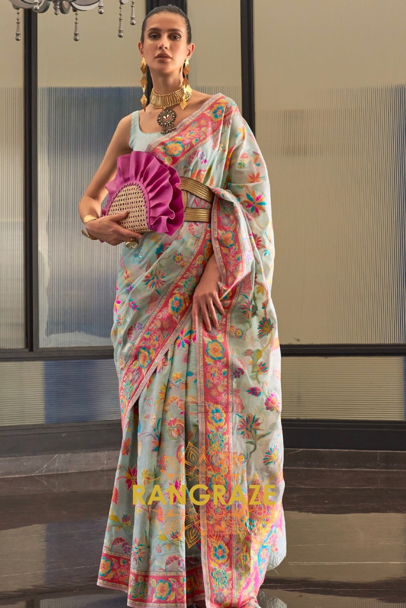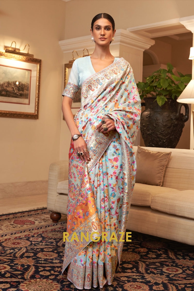 Ice Blue Multi Color Woven Pashmina Jamewar Saree