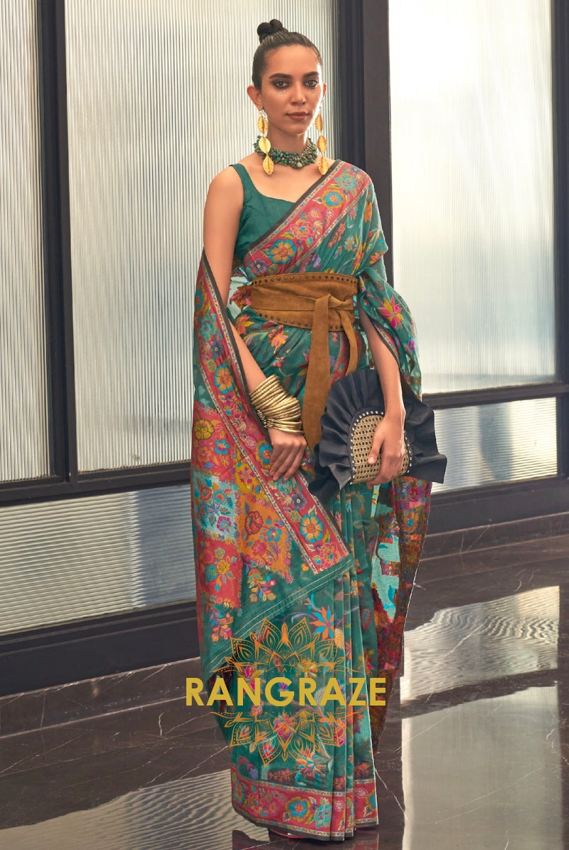 Turquoise Blue Kashmiri Modal Handloom Weaving Jamewar Saree