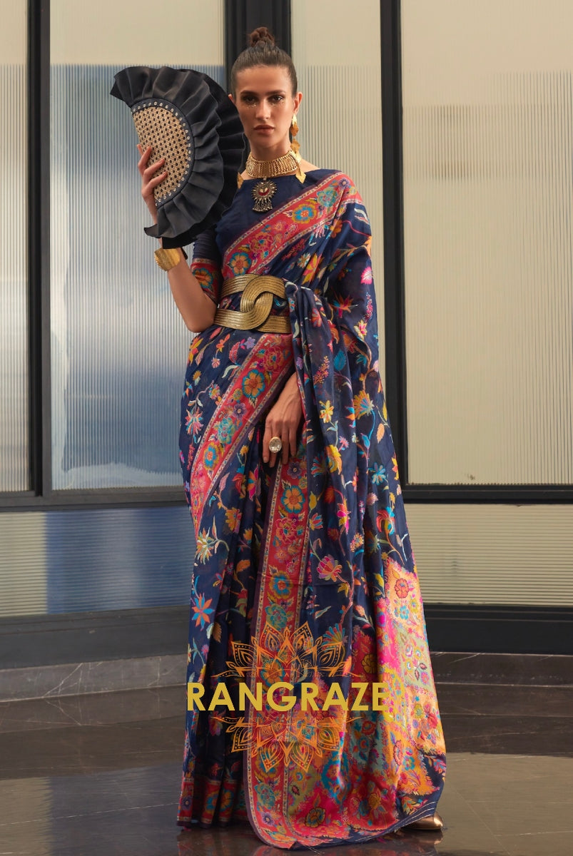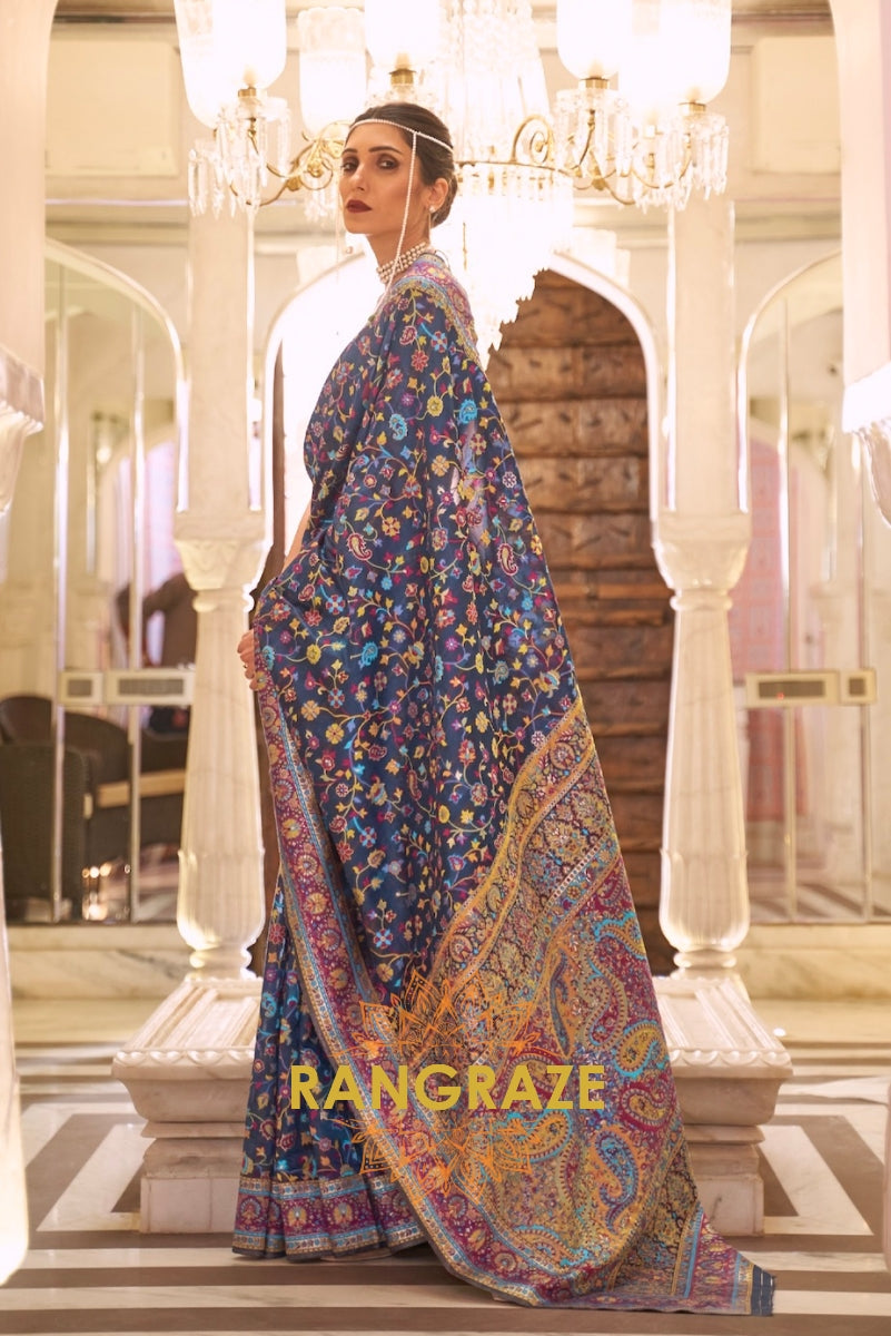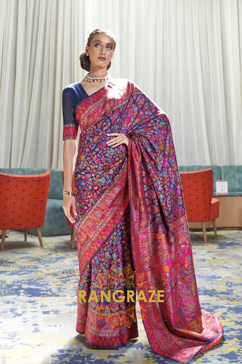 Navy Blue Multi Color Kashmiri Jamewar Weave Saree
