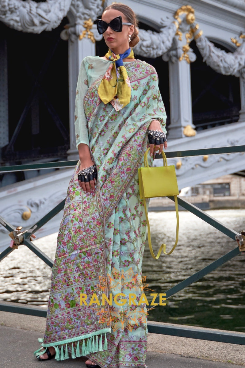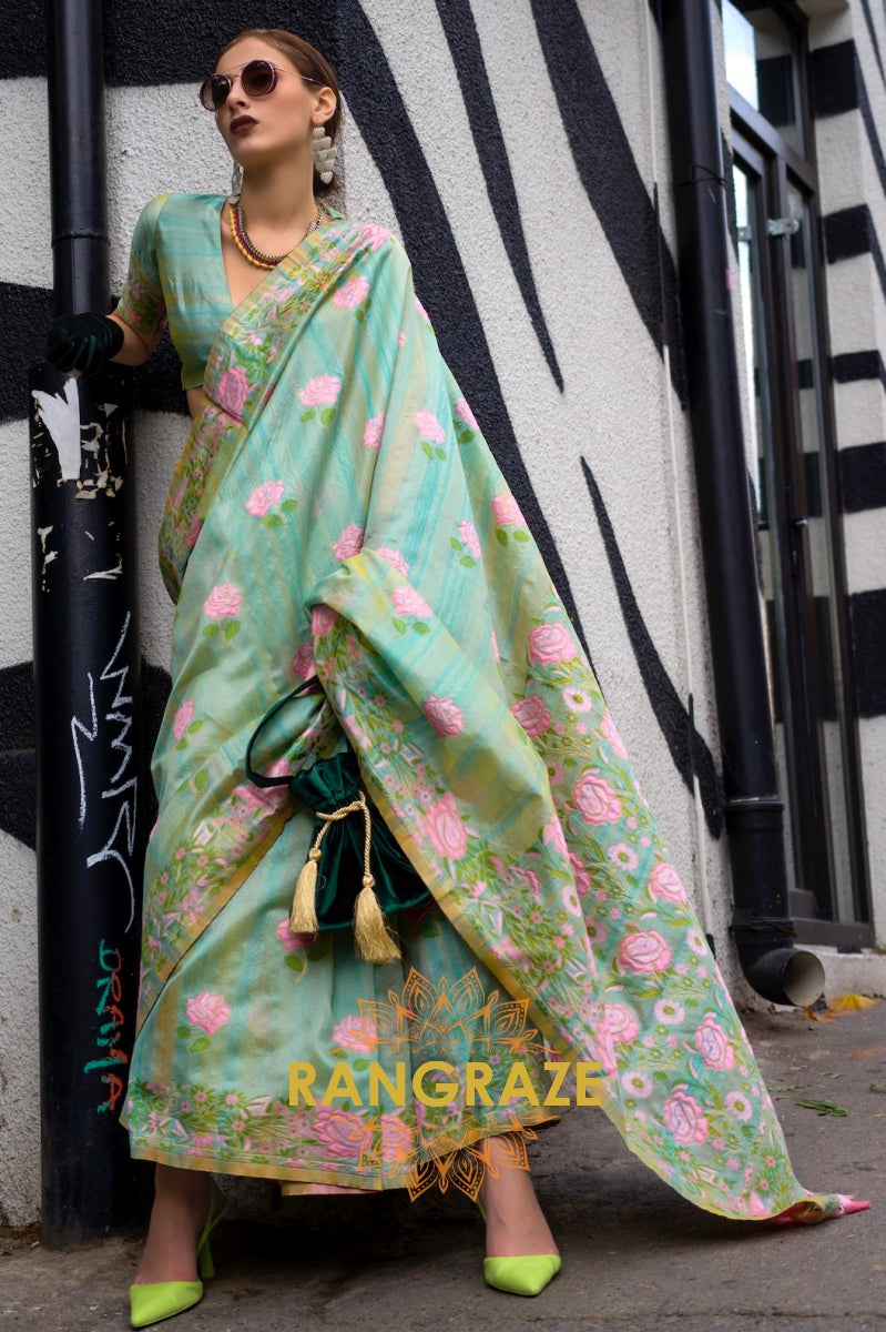 Turquoise Green Organza Parsi Handloom Weaving Jamewar Saree