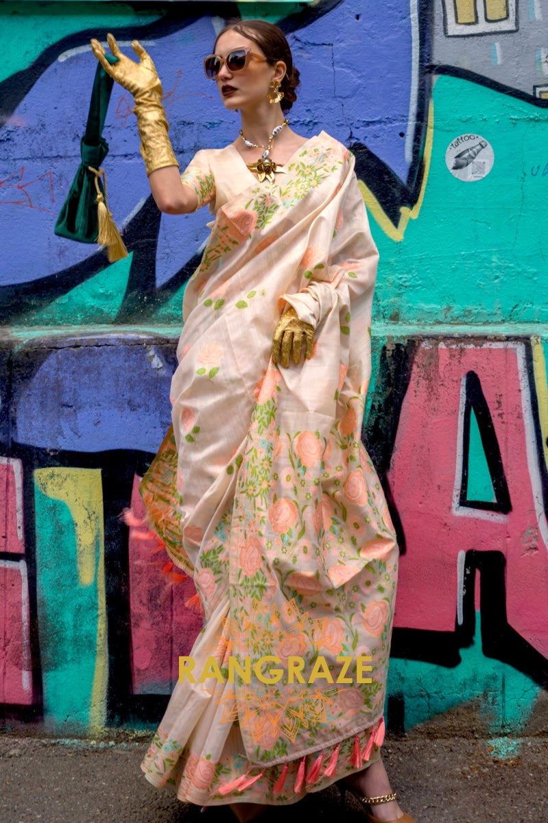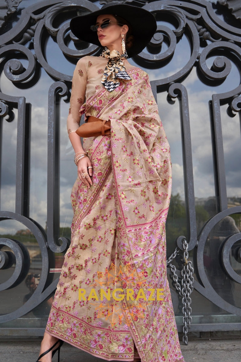 Cream Beige Organza Parsi Handloom Weaving Jamewar Saree