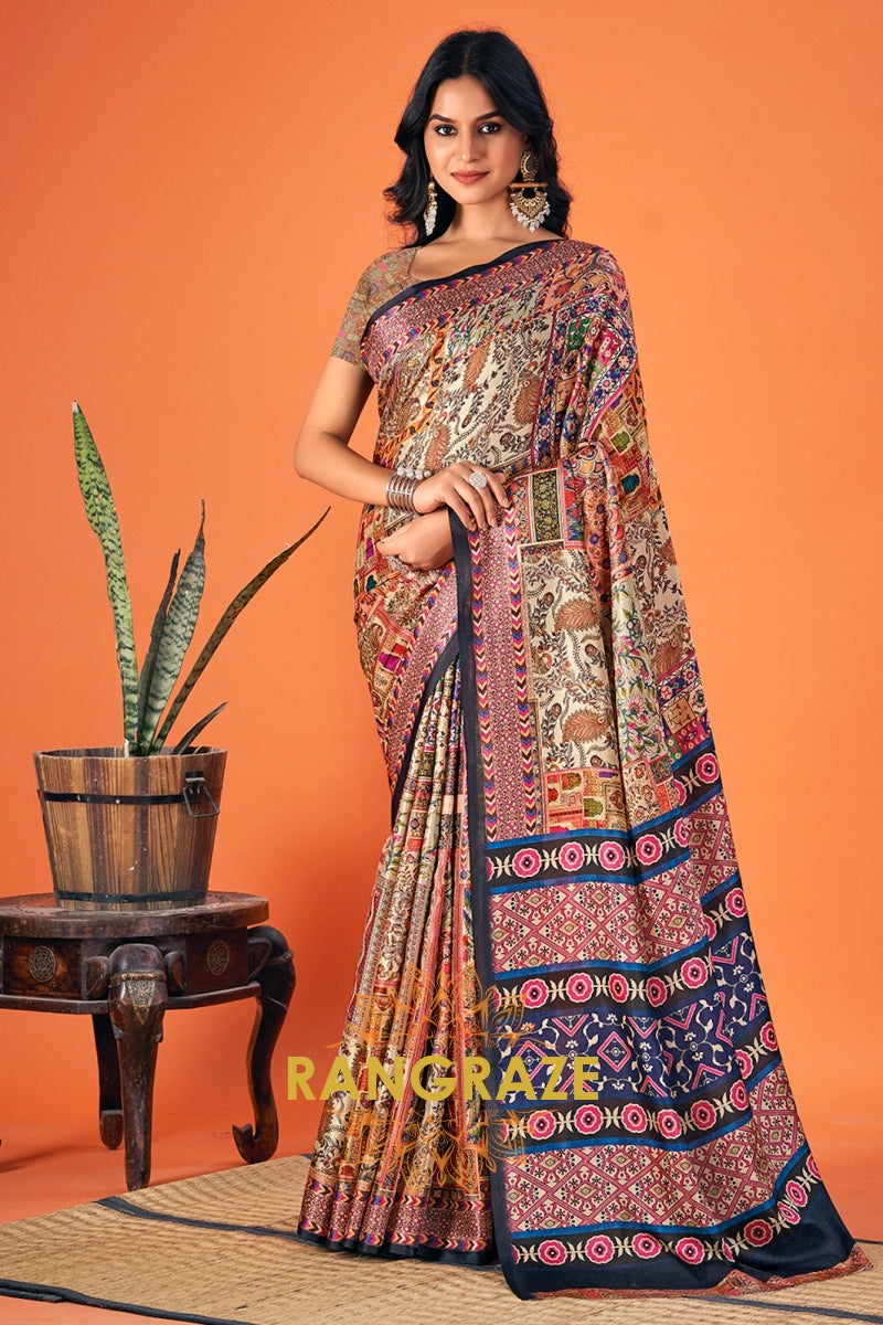 Royal Beige Multi Color Printed Pashmina Jamewar Saree