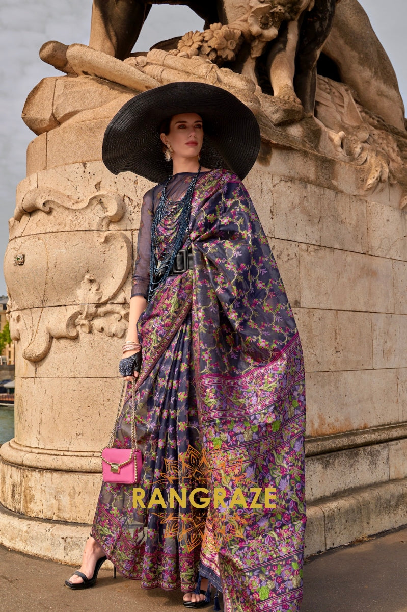 Royal Black Multi Color Printed Pashmina Jamewar Saree