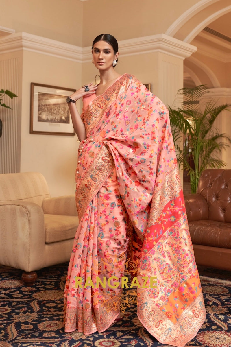 Peach Pink Multi Color Woven Pashmina Jamewar Saree