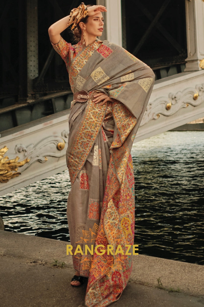 Magical Grey Kashmiri Modal Handloom Weaving Jamewar Saree