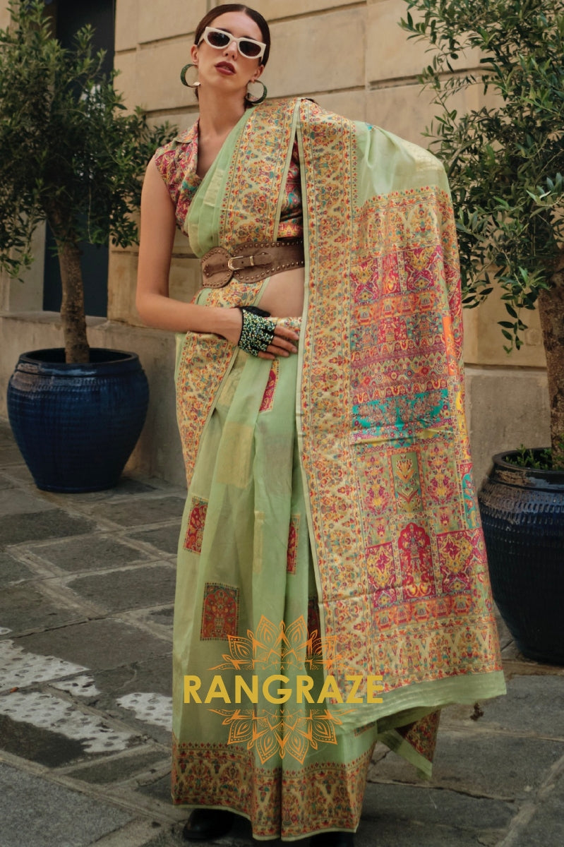 British Green Kashmiri Modal Handloom Weaving Jamewar Saree