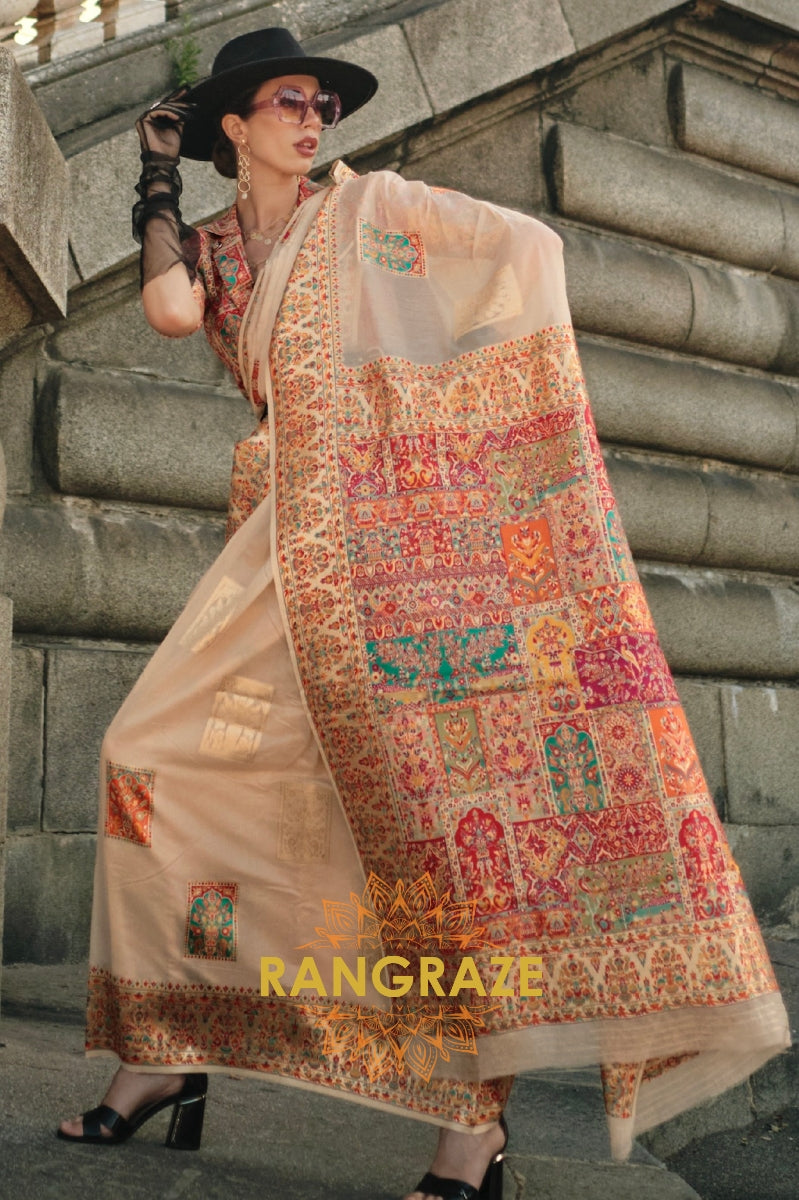 Royal Beige Multi Color Printed Pashmina Jamewar Saree