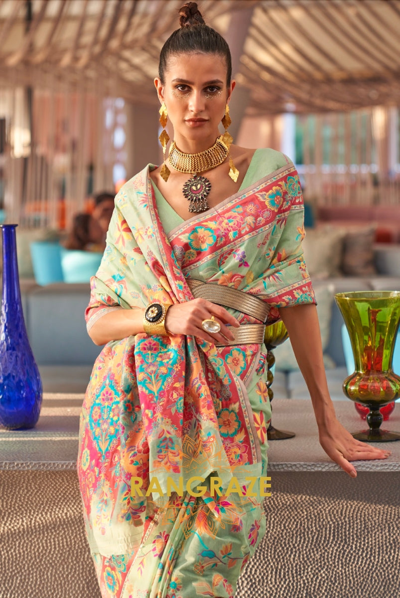 Royal Pastel Green Multi Color Kashmiri Jamewar Weave Saree