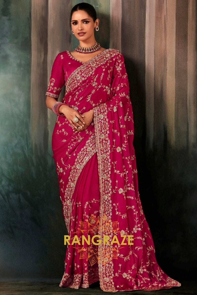 Pure Organza Embroidered Saree in Fuchsia Pink