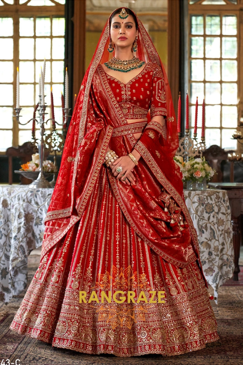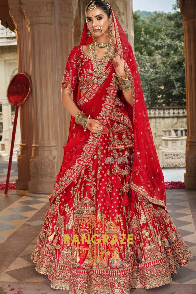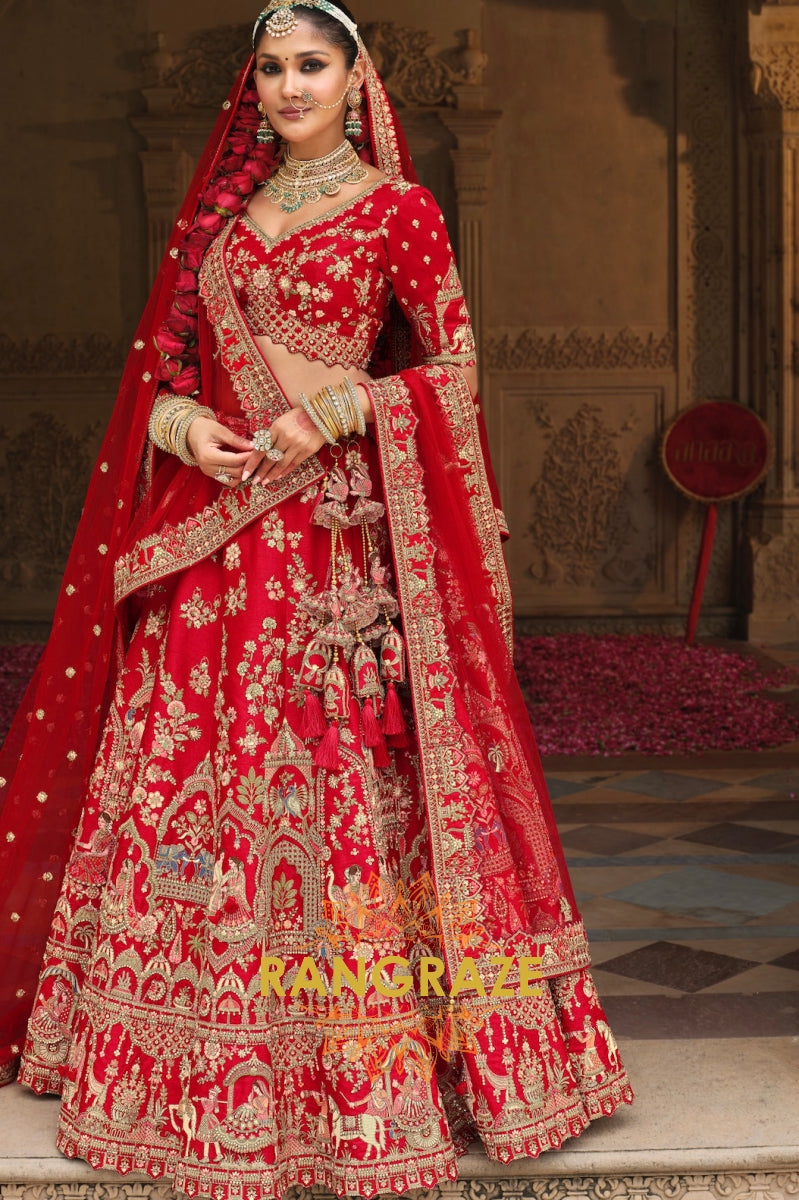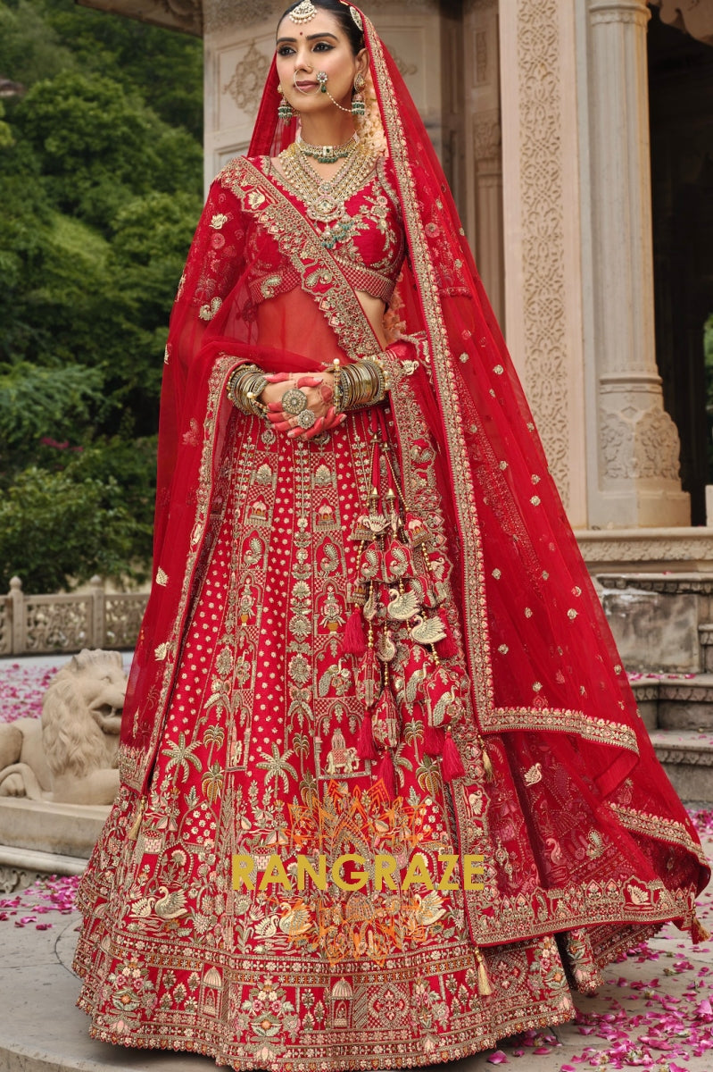 Ruhani Zohra Double-Dupatta Bridal Silk Lehenga – The Empress in Scarlet Bloom