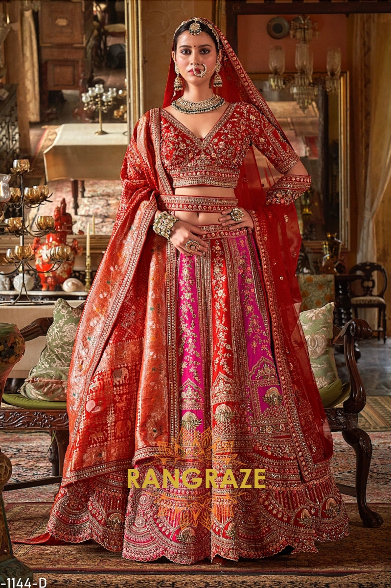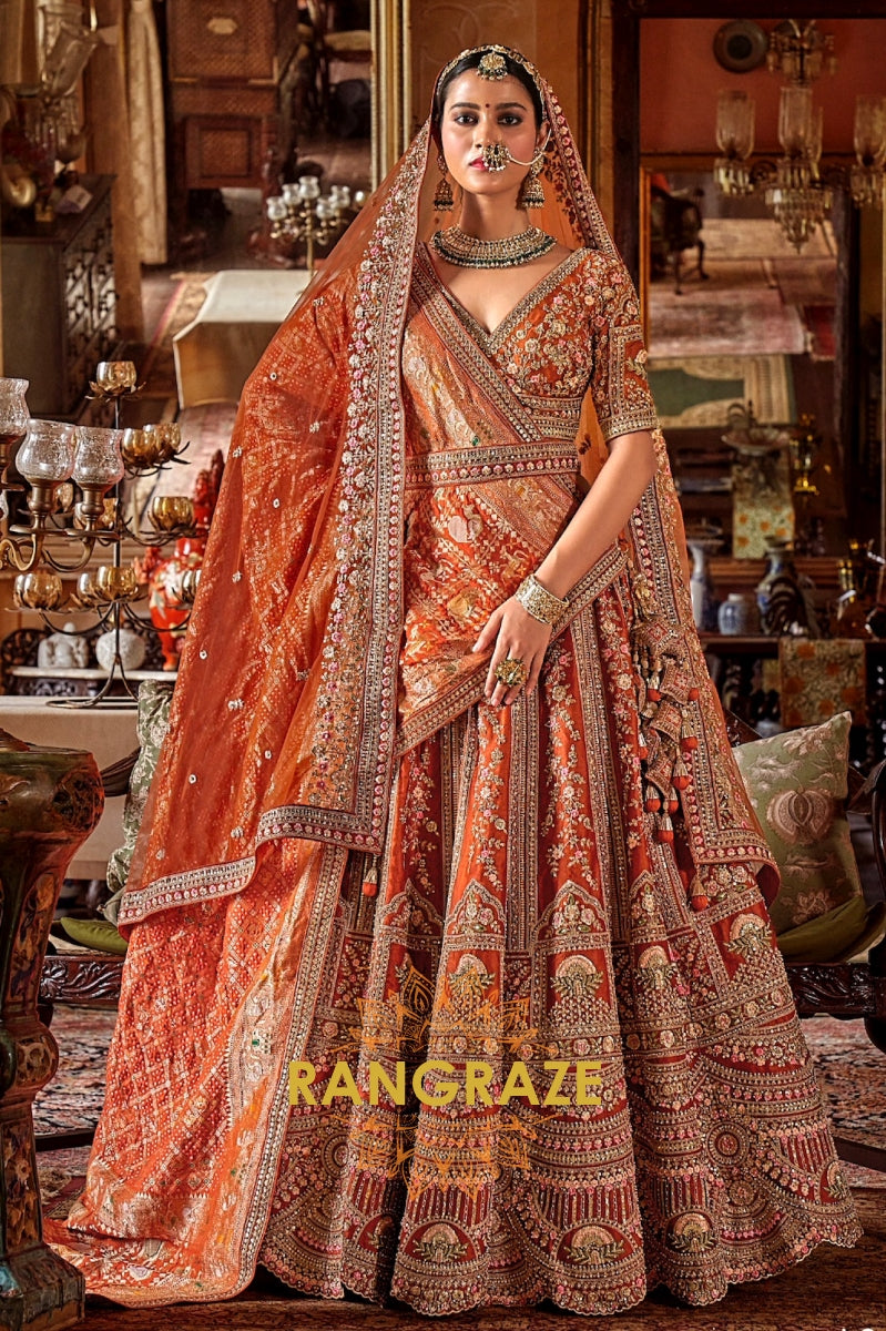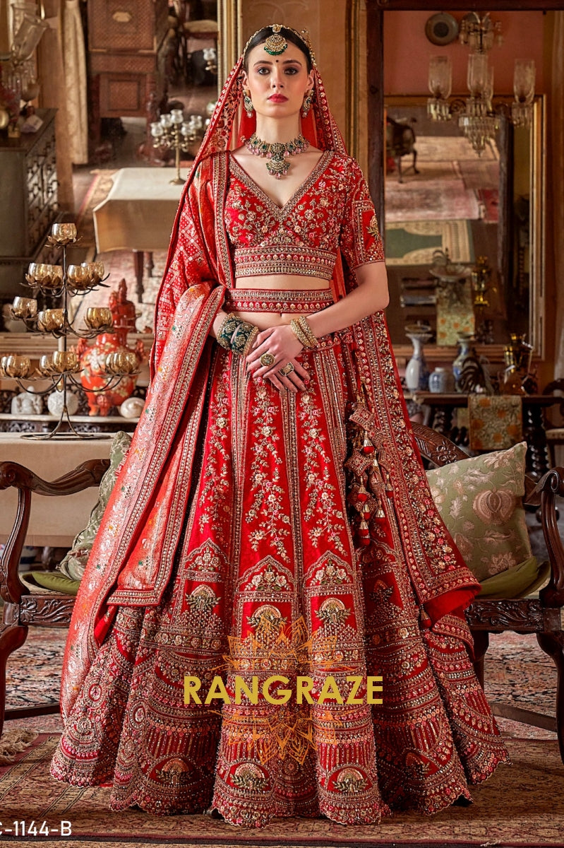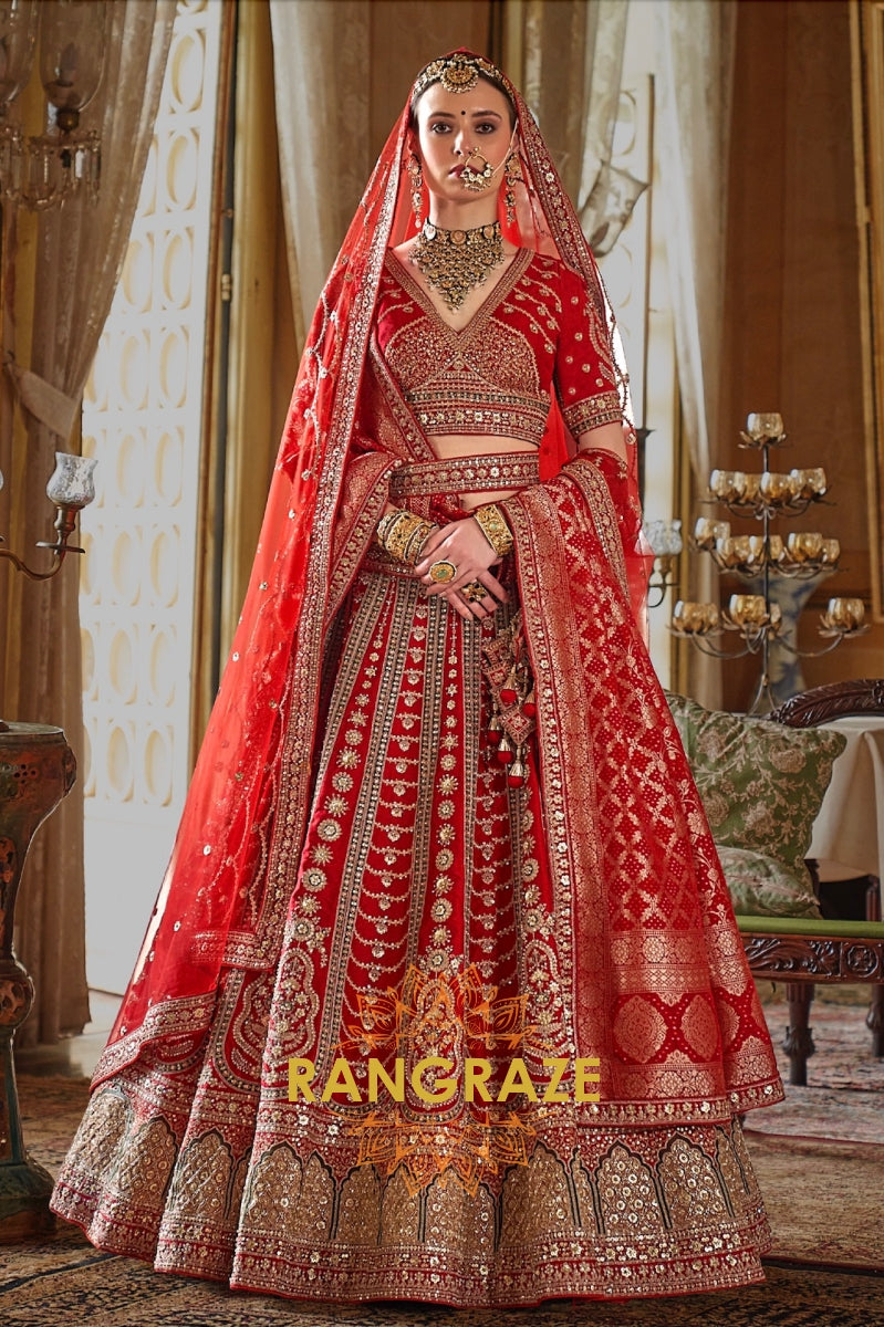 Royal Vermilion Double-Dupatta Bridal Banarasi Silk Lehenga – A Symphony of Heritage and Grandeur