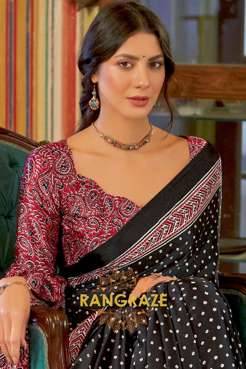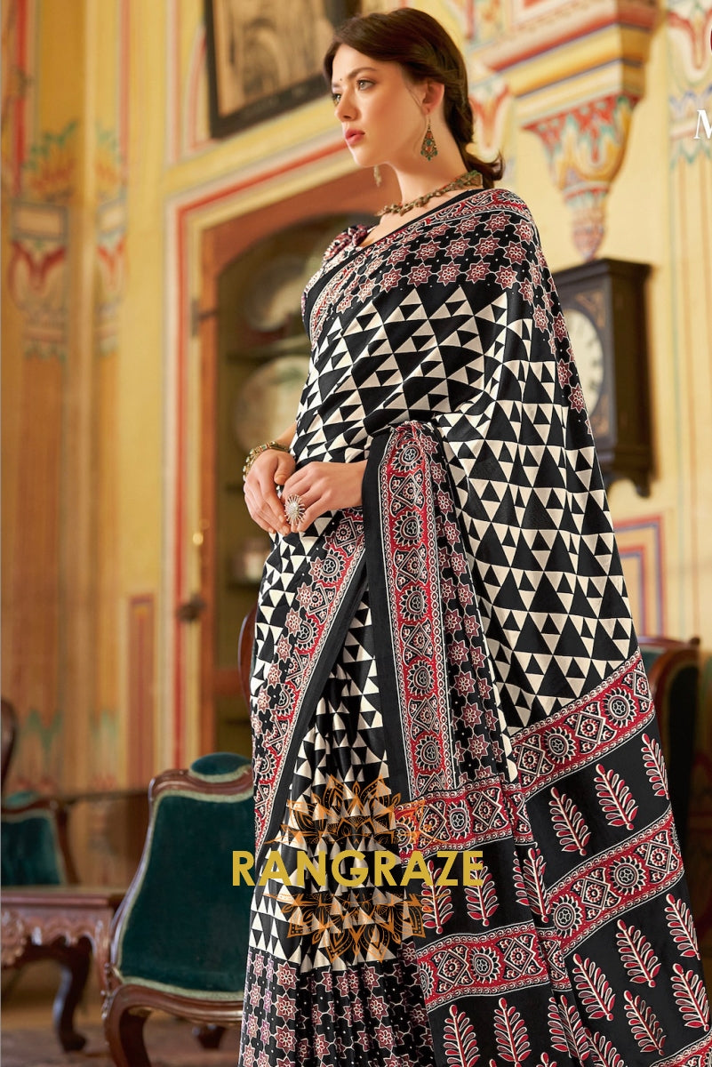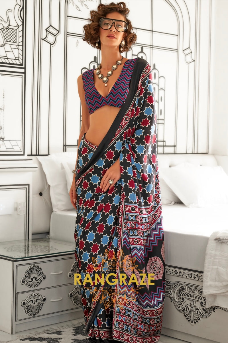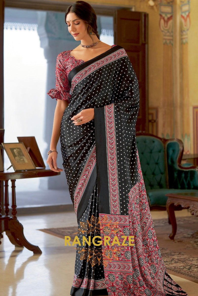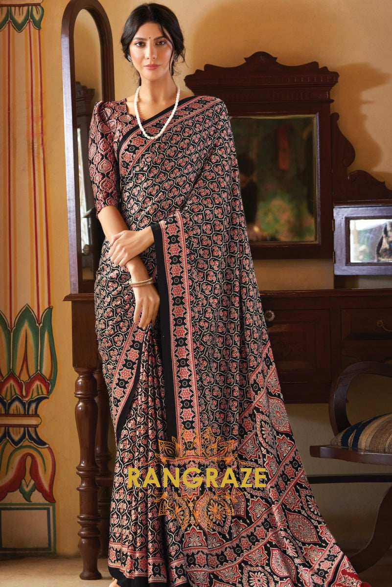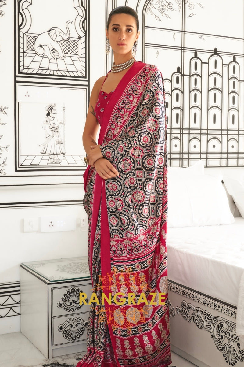 Black and Red Printed Ajrakh Printed Satin Crepe Saree