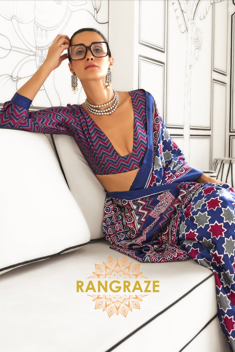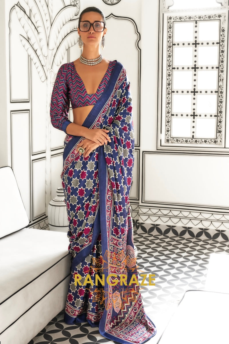Blue and Red Ajrakh Printed Satin Crepe Saree