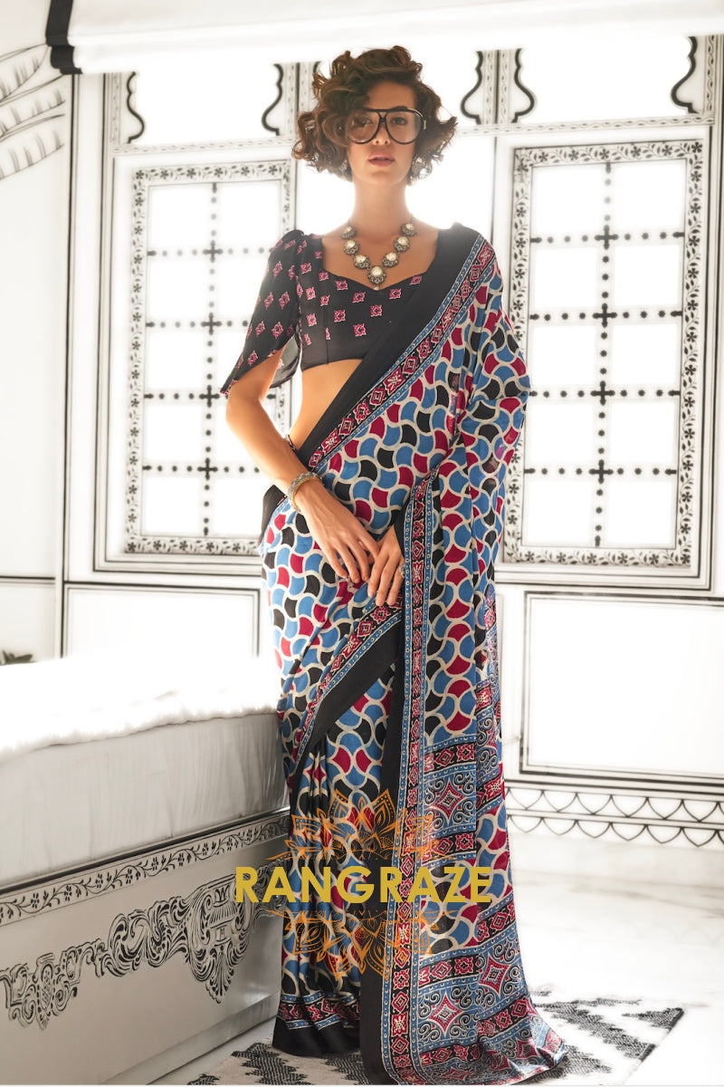 Black and Sky Blue Ajrakh Printed Satin Crepe Saree