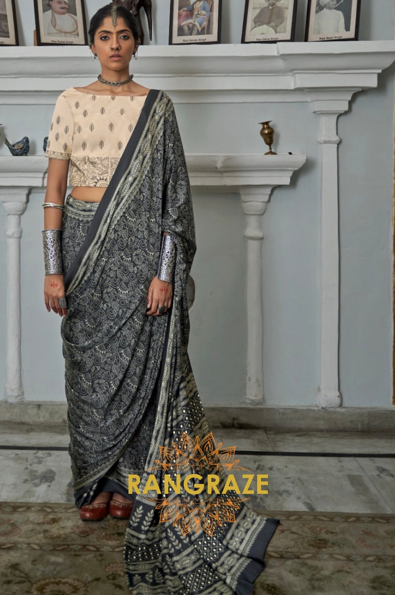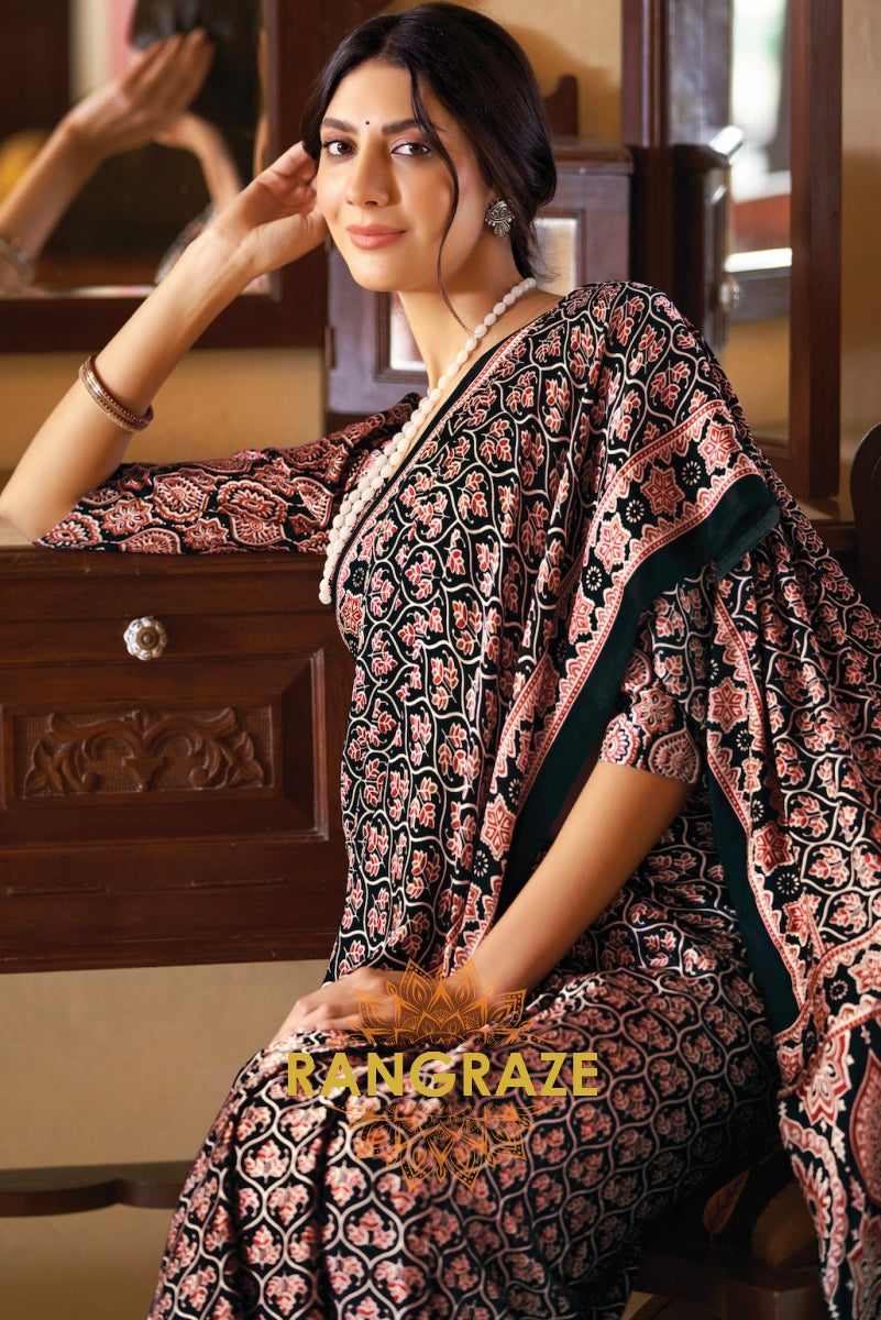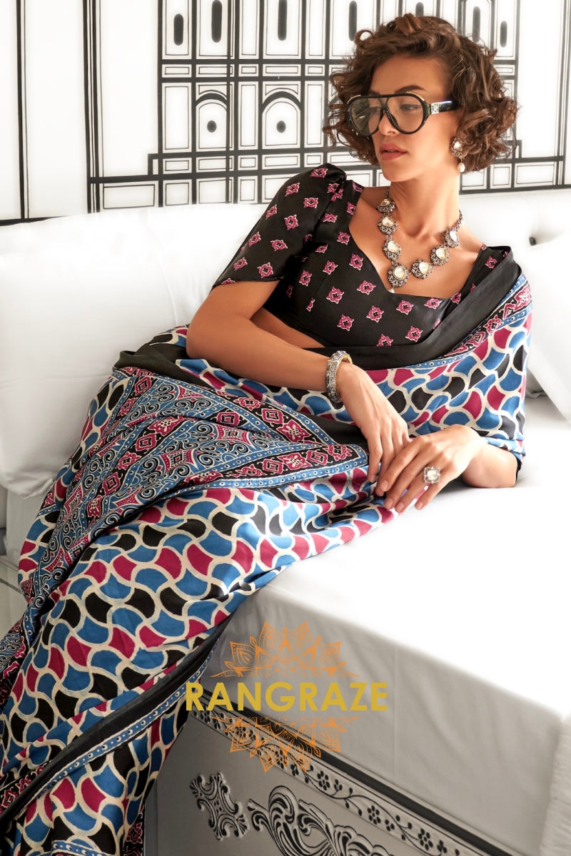 Black Shade Ajrakh Printed Satin Silk Saree