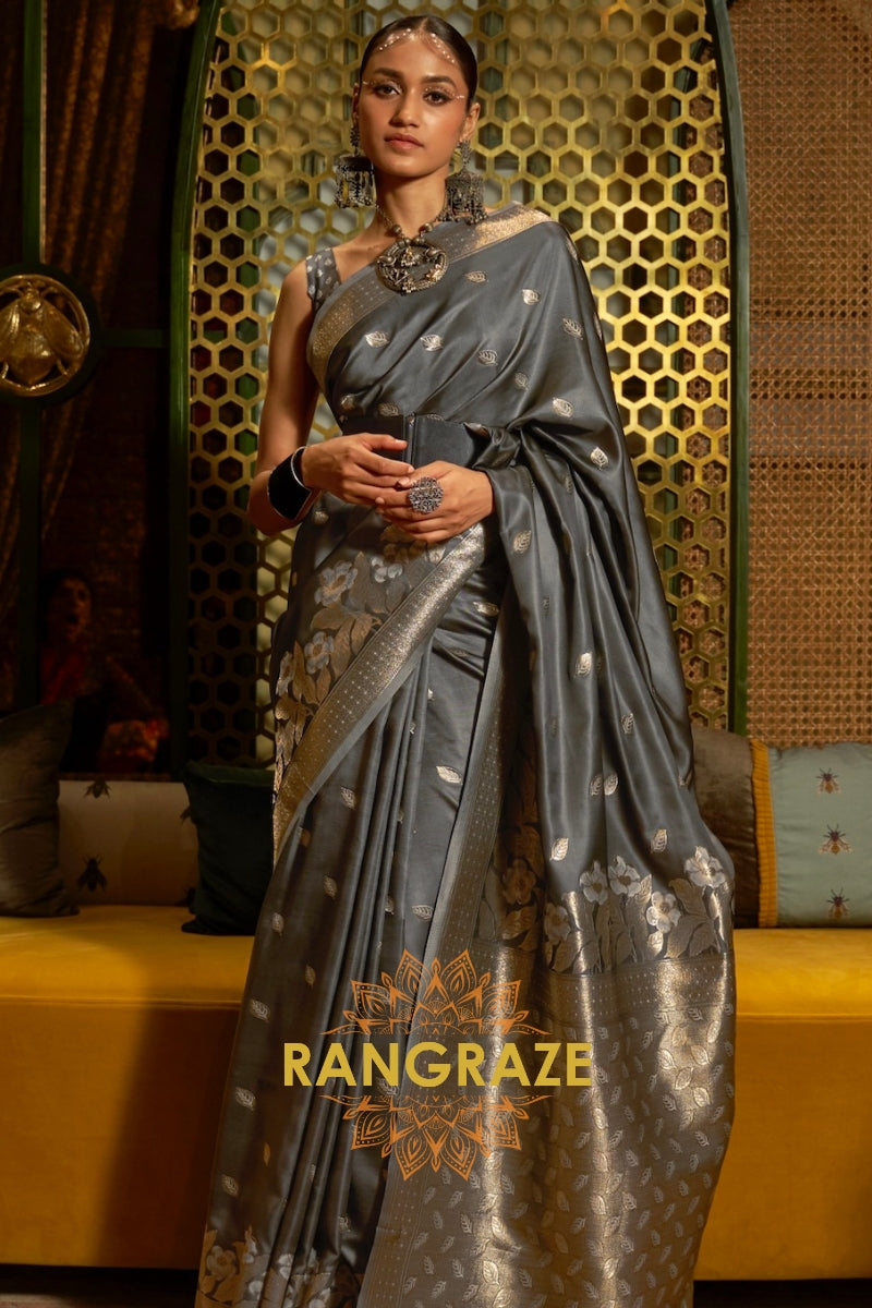 Charcoal Black Woven Banarasi Silk Saree With Gold And Silver Zari