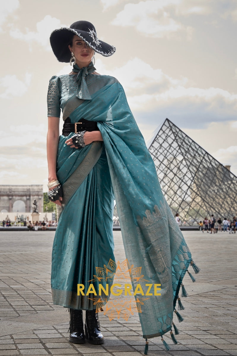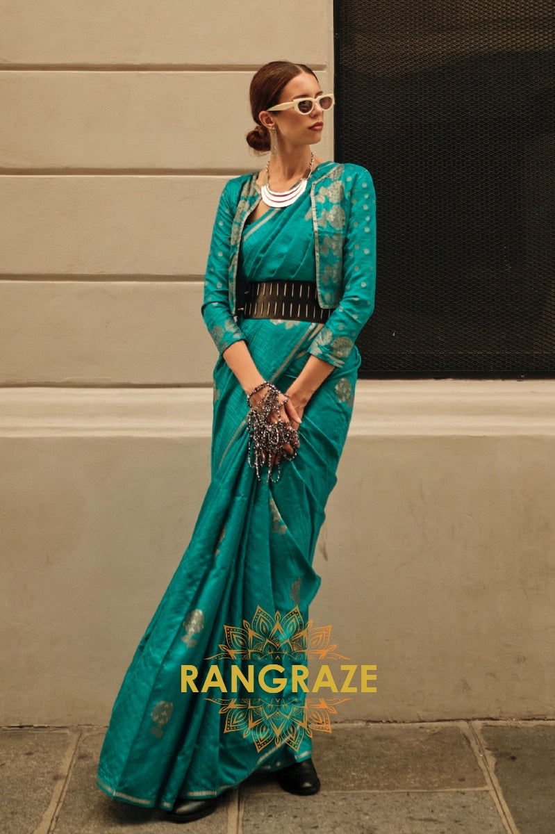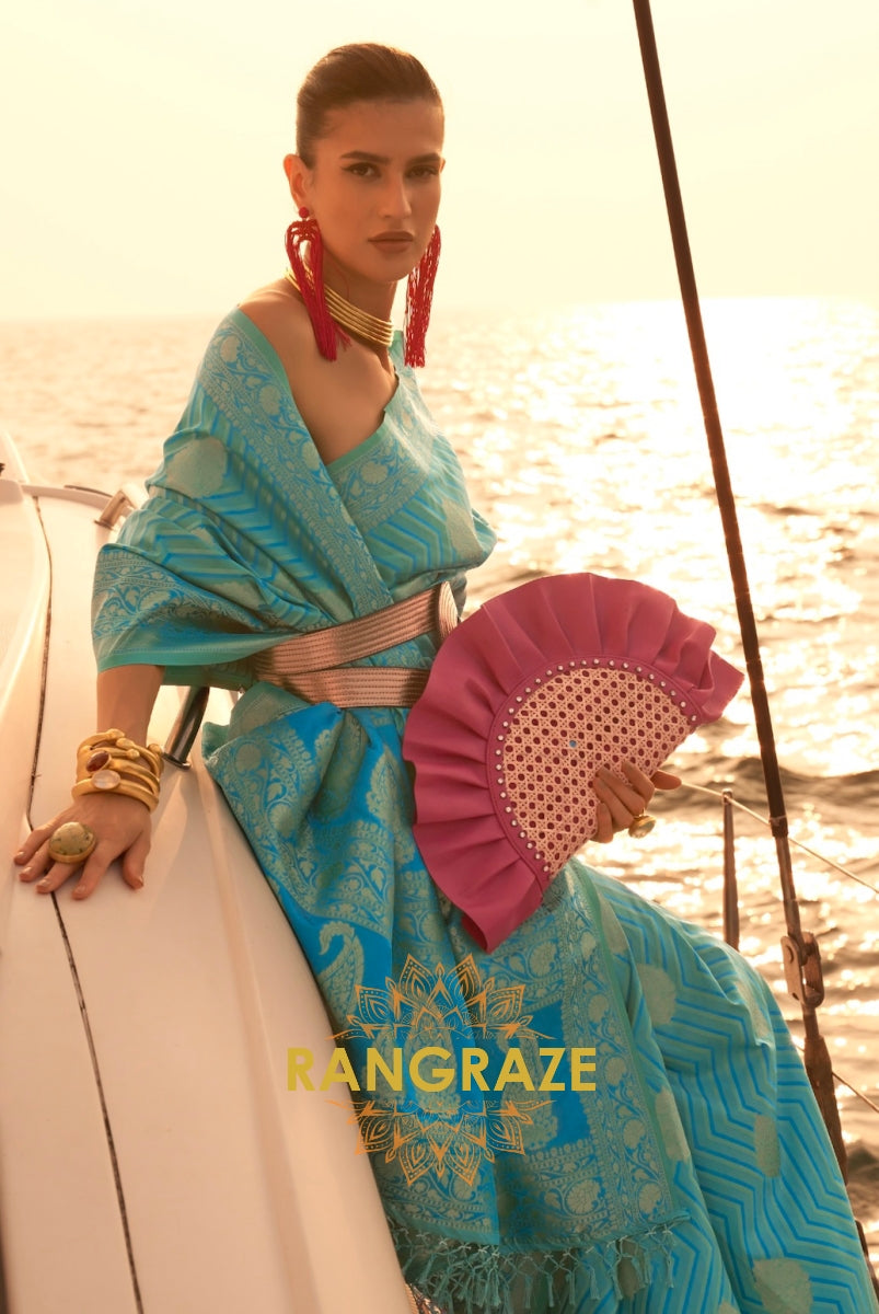 This stunning Banarasi soft silk saree from Rangraze's semi-luxury collection features a vibrant aqua blue...
