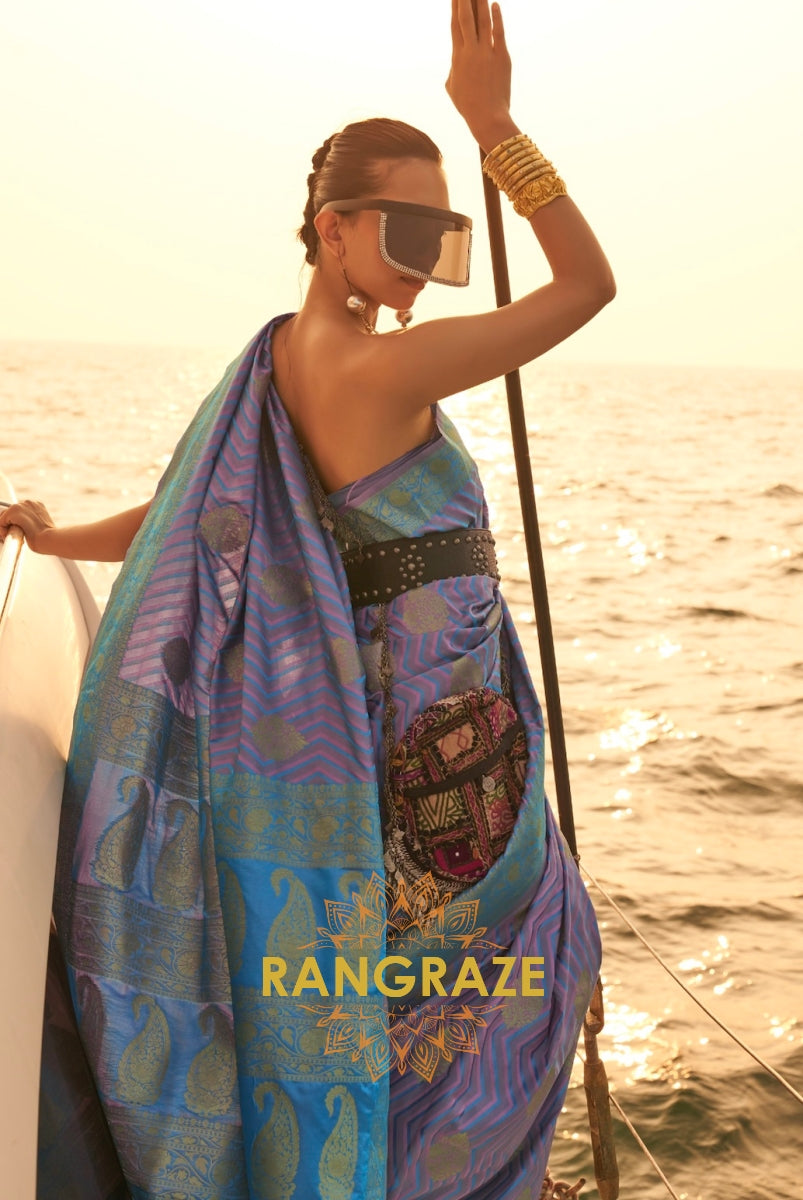 Coral Ocean Blue Dual Tone Banarasi Satin Silk Saree