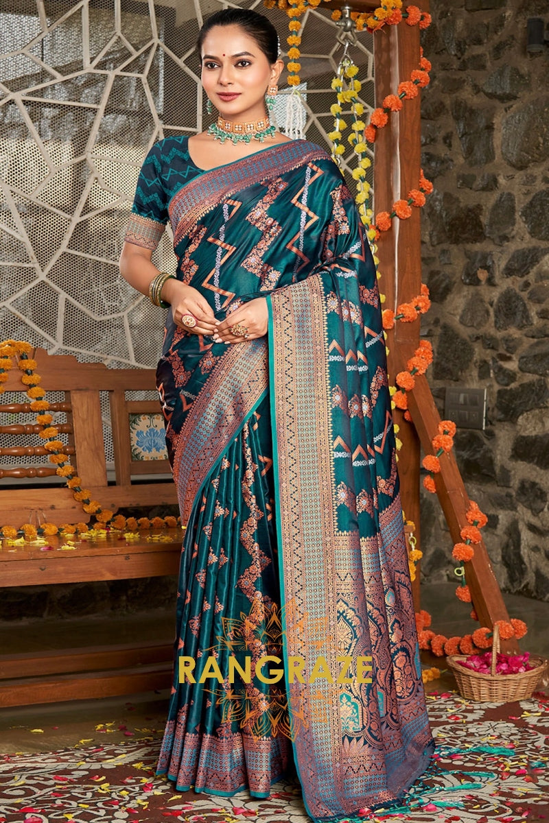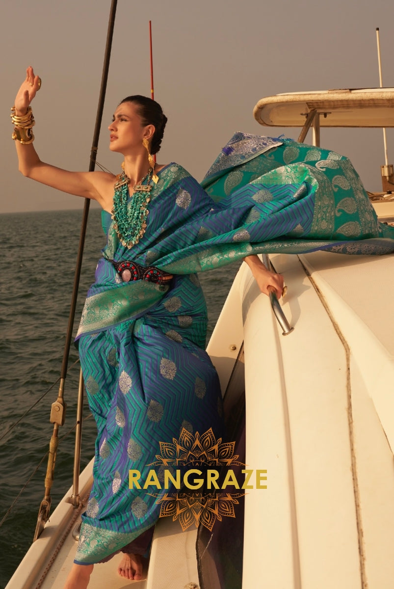 Coral Aegean Blue Dual Tone Banarasi Satin Silk Saree