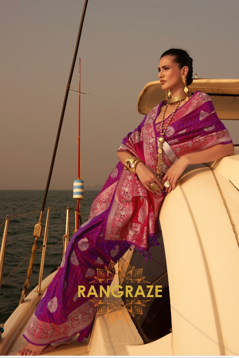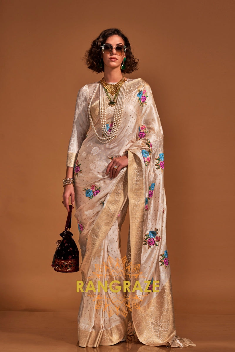 This luxurious Woven Banarasi Satin Silk saree from Rangraze’s semi-luxury collection features an opulent champagne...