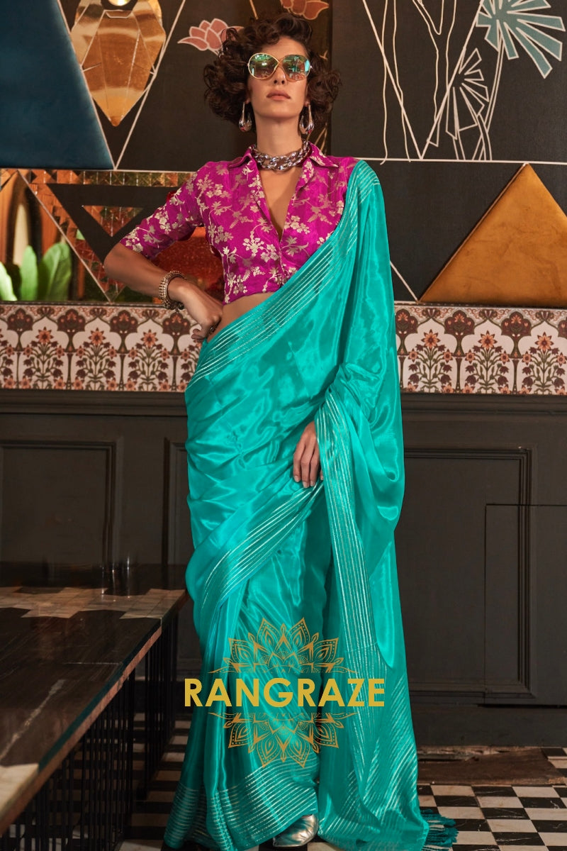 Aqua Bliss Banarasi Soft Silk Saree with Magenta Contrast Blouse