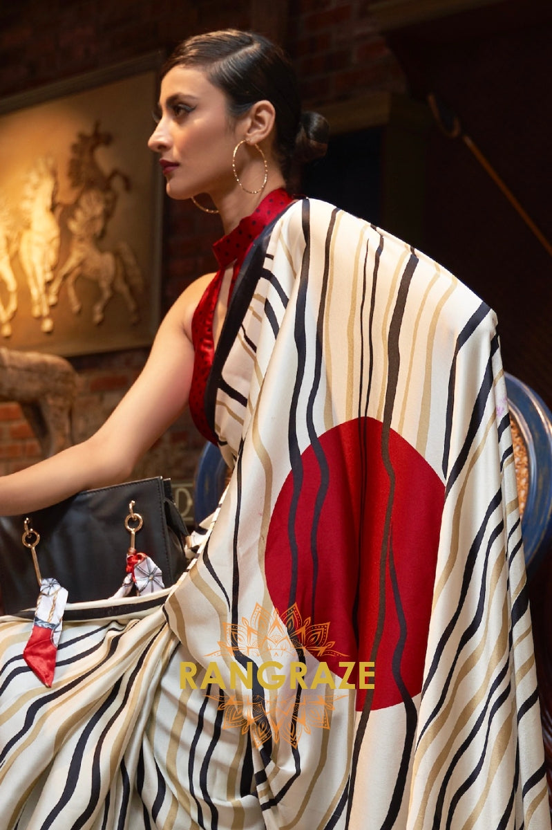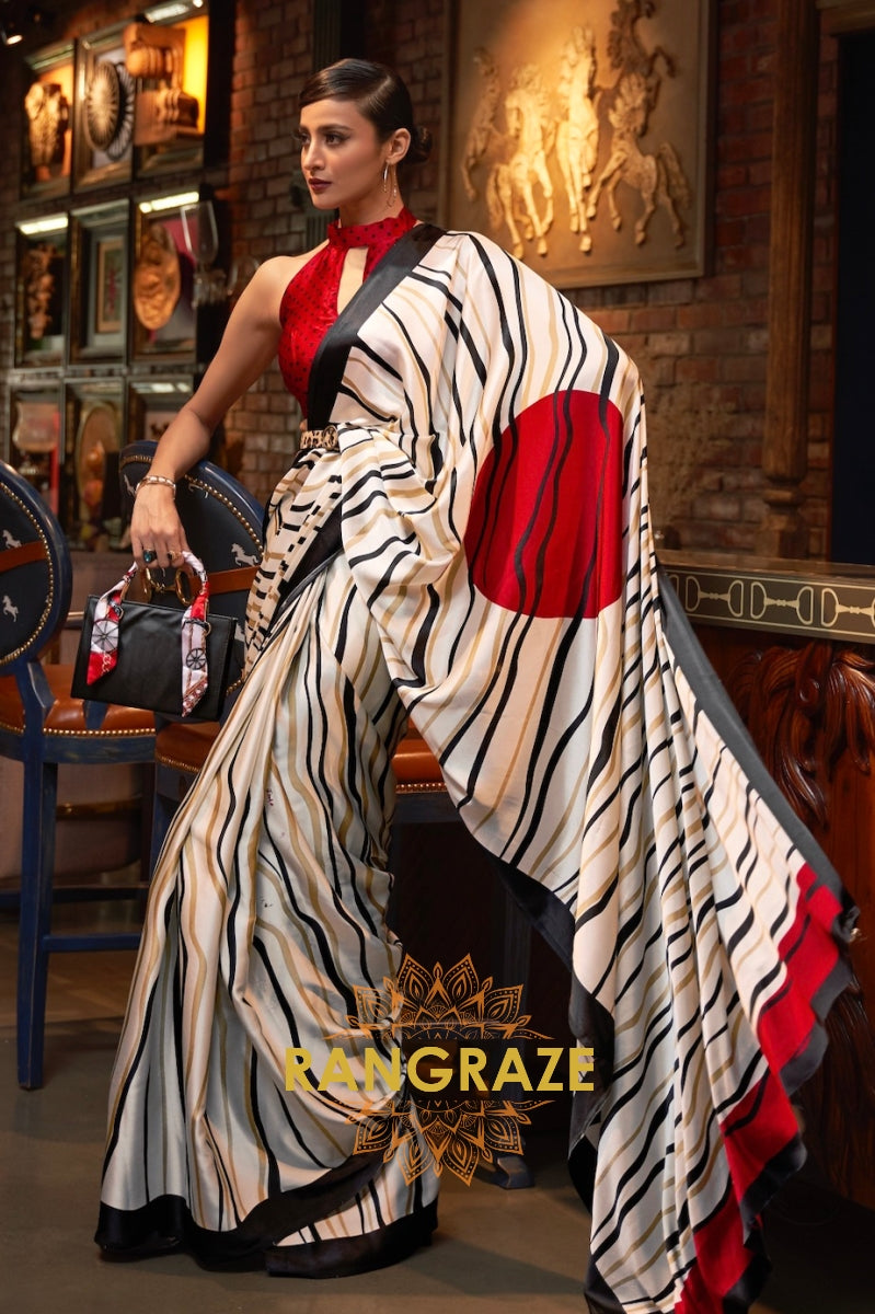 Black White Striped Satin Silk Printed Saree