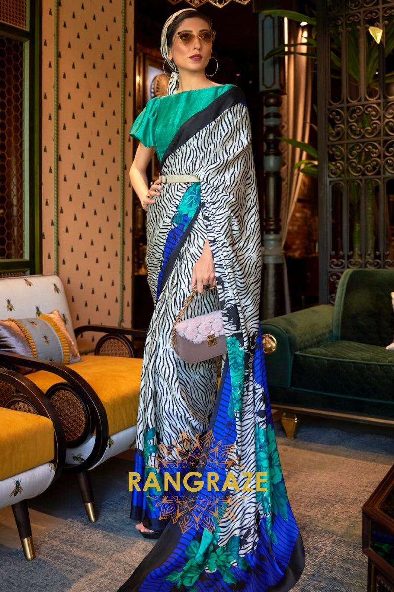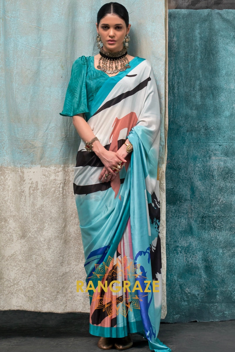 Aqua And White Abstract Printed Satin Crepe Saree